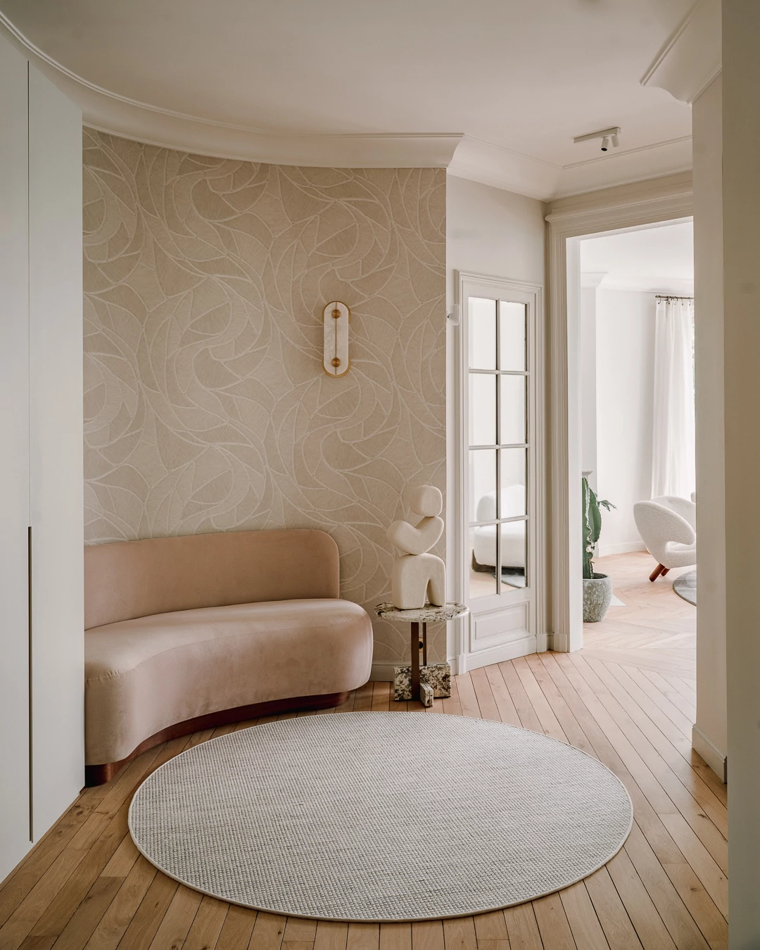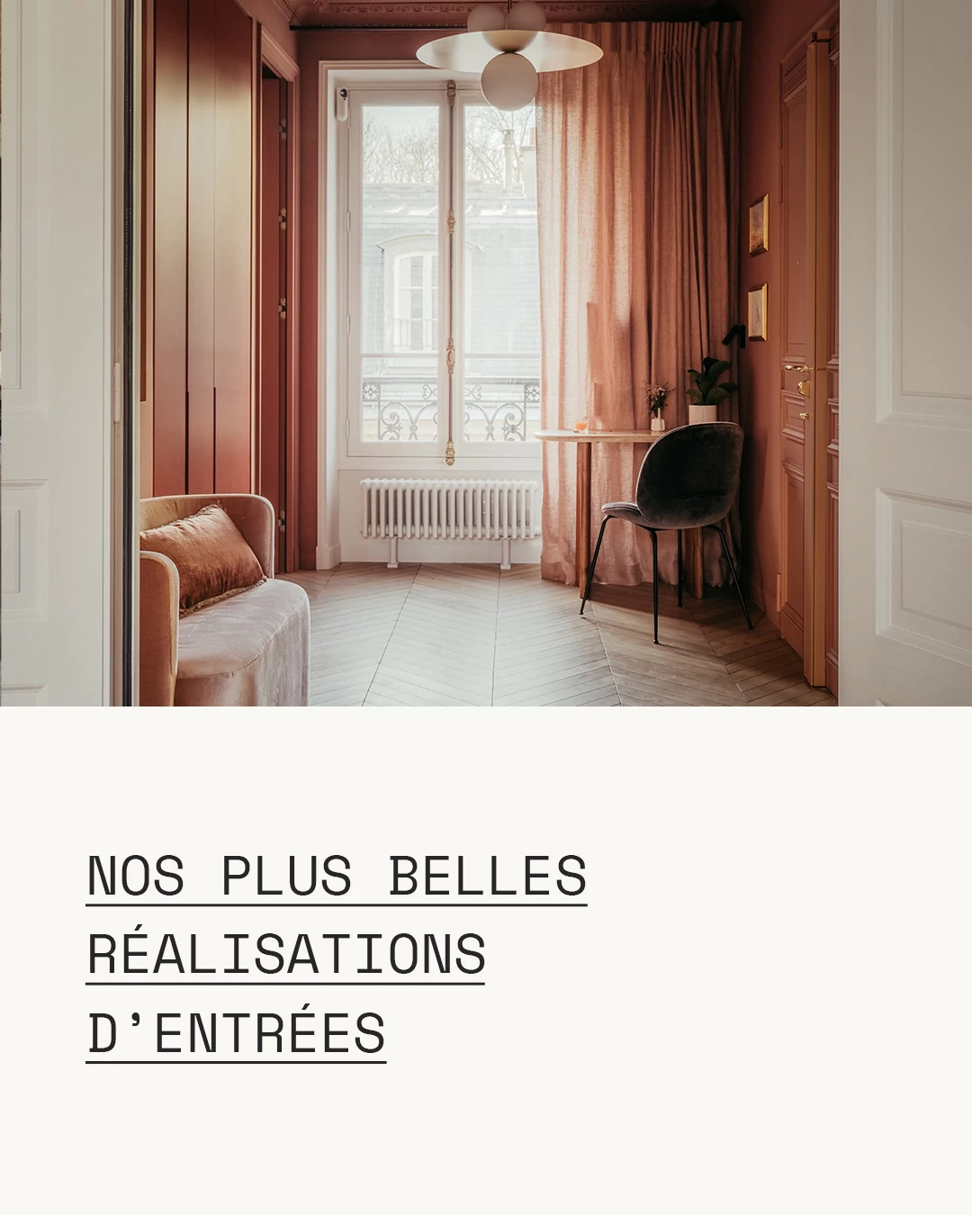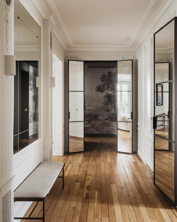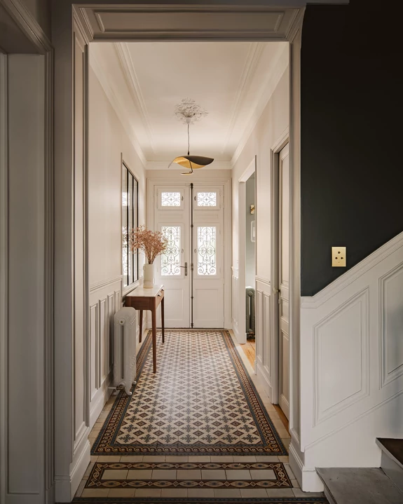 L’entrée donne le ton de l’appartement. C’est la première impression, celle qui annonce l’ambiance intérieure, elle mérite donc une attention particulière. Nous concevons toujours cet espace de passage comme une pièce à part entière, en accordant une grande importance à la luminosité, à l’ergonomie et à la fonctionnalité.
