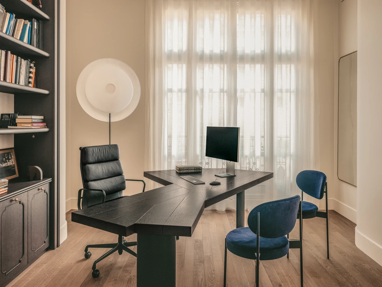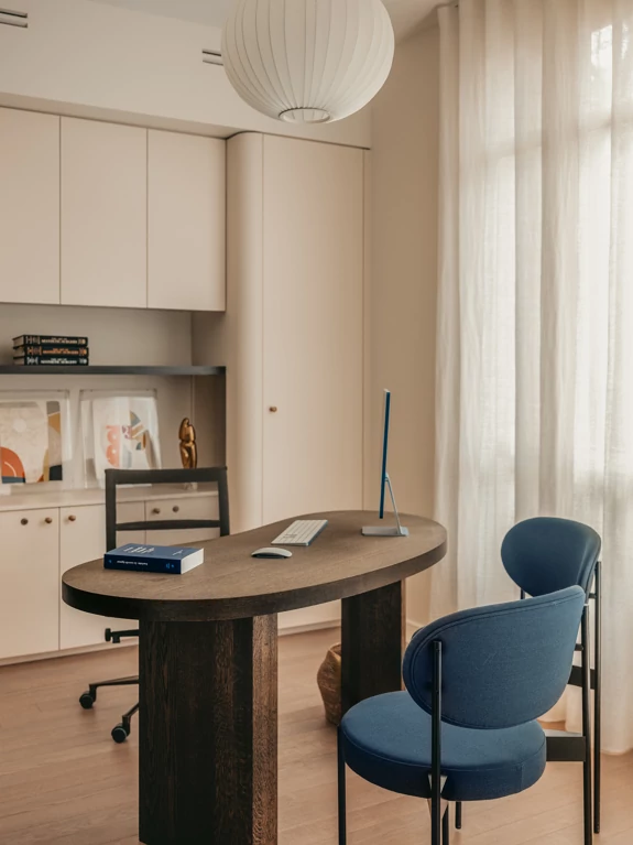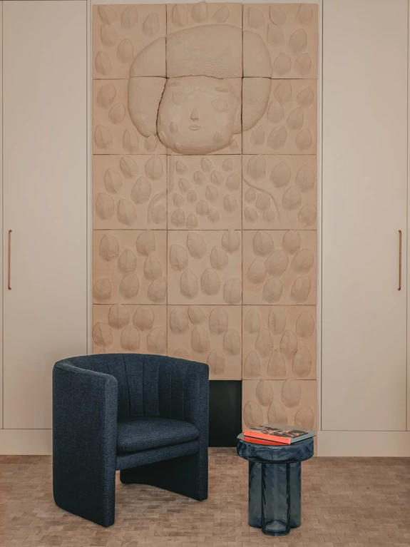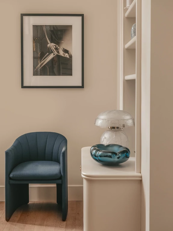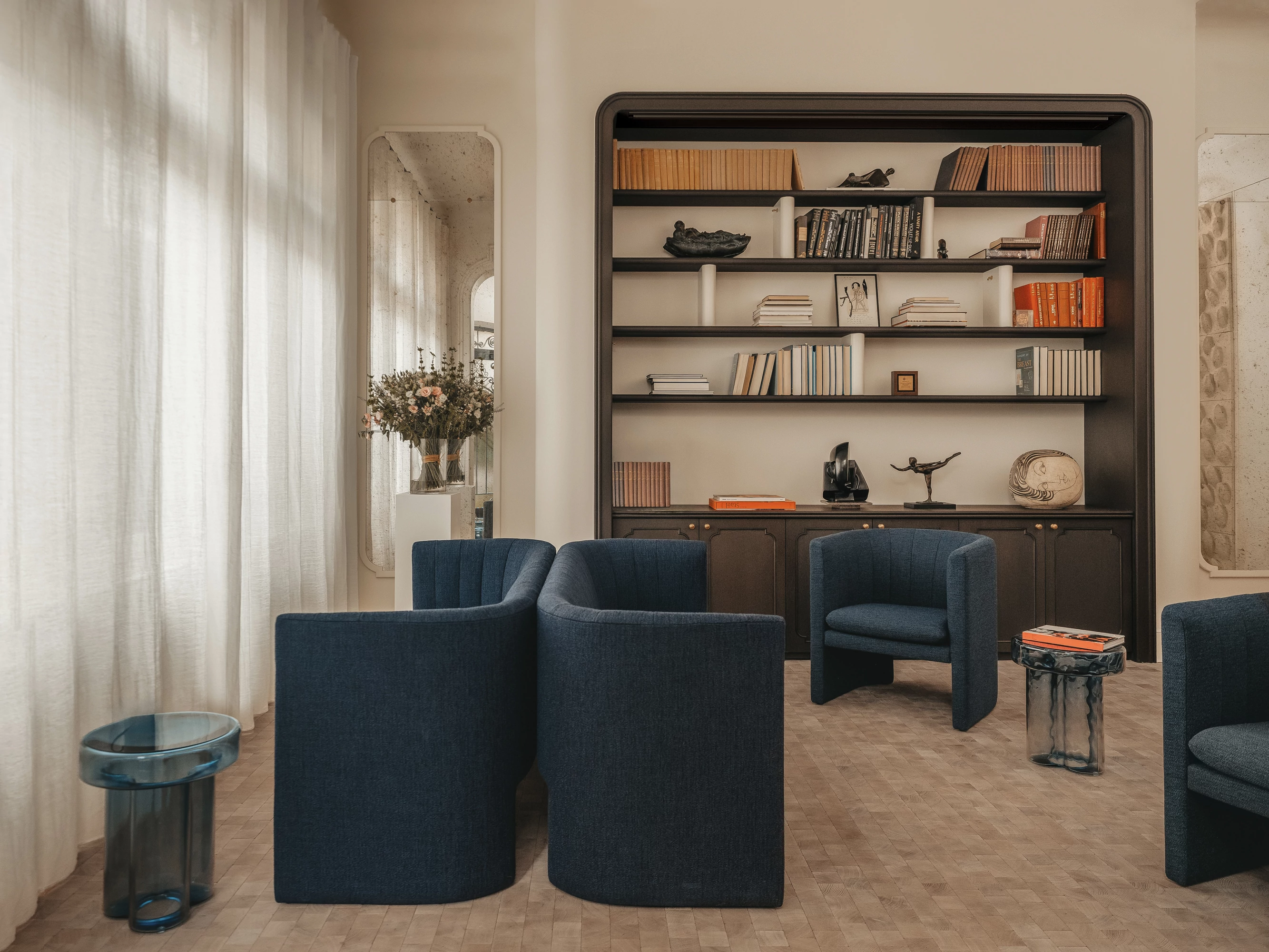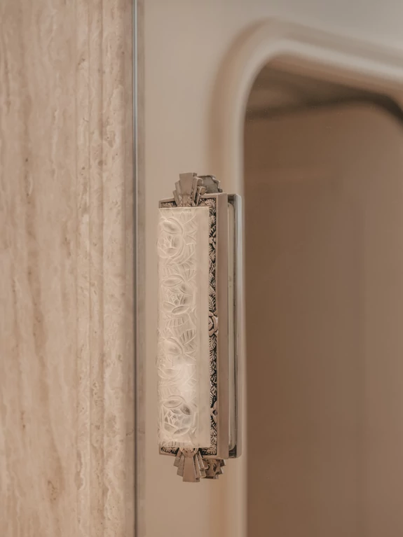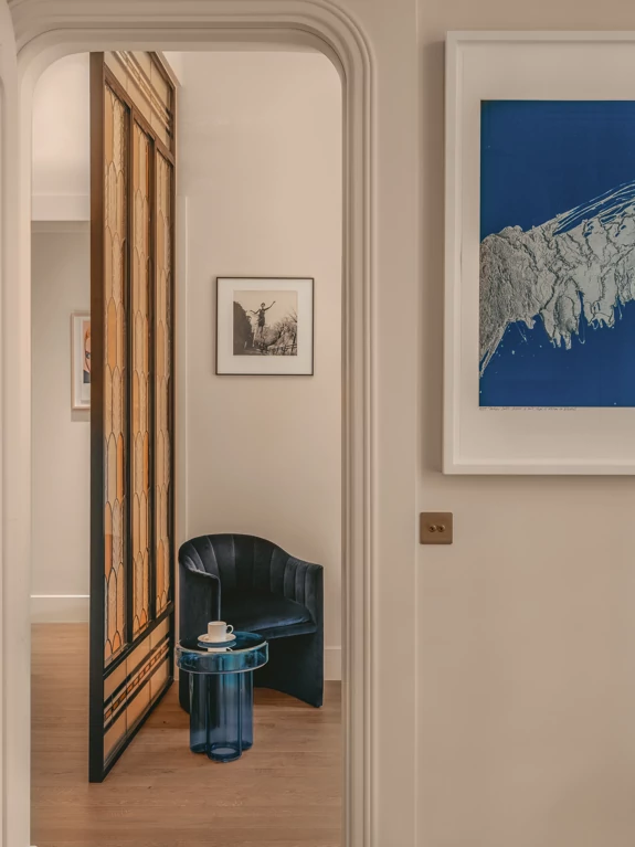 L’Art Déco est ainsi réinterprété de manière contemporaine, à travers l’utilisation de courbes élégantes, de lignes structurées et de détails décoratifs raffinés, intégrés avec justesse dans les espaces. Cette écriture architecturale se développe dans le dessin des arches, des portes, des bibliothèques.