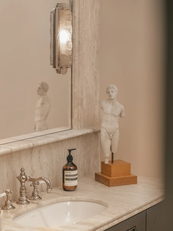 Le travertin introduit une note minérale, à la fois douce et intemporelle. Utilisé avec parcimonie, il dialogue avec le bois et équilibre la composition par sa texture et sa sobriété.