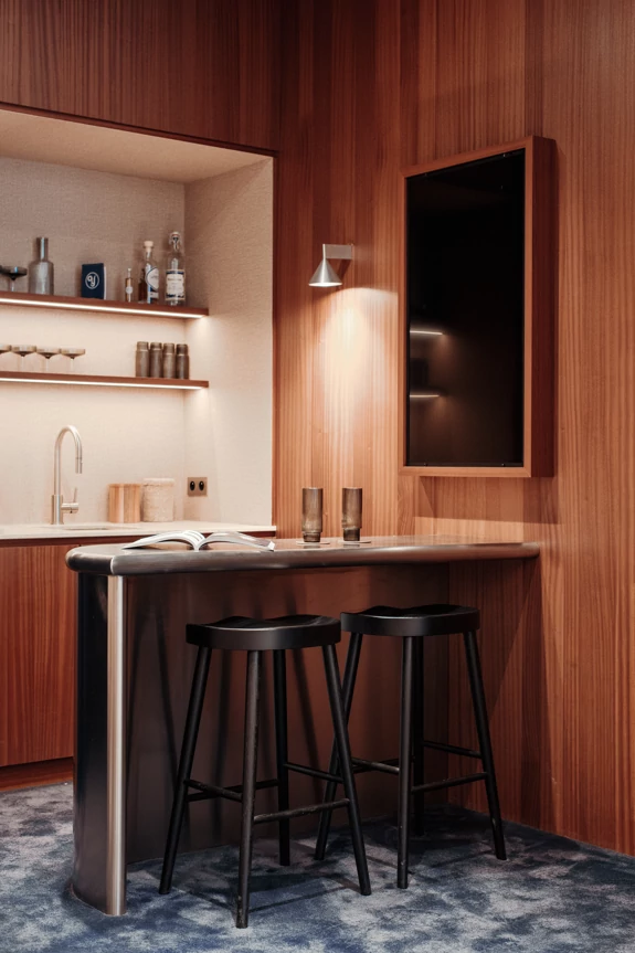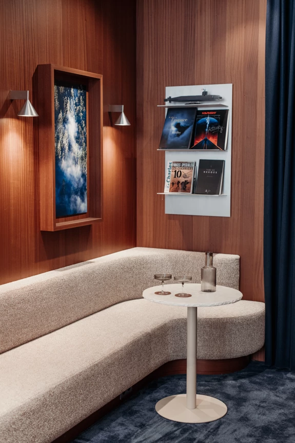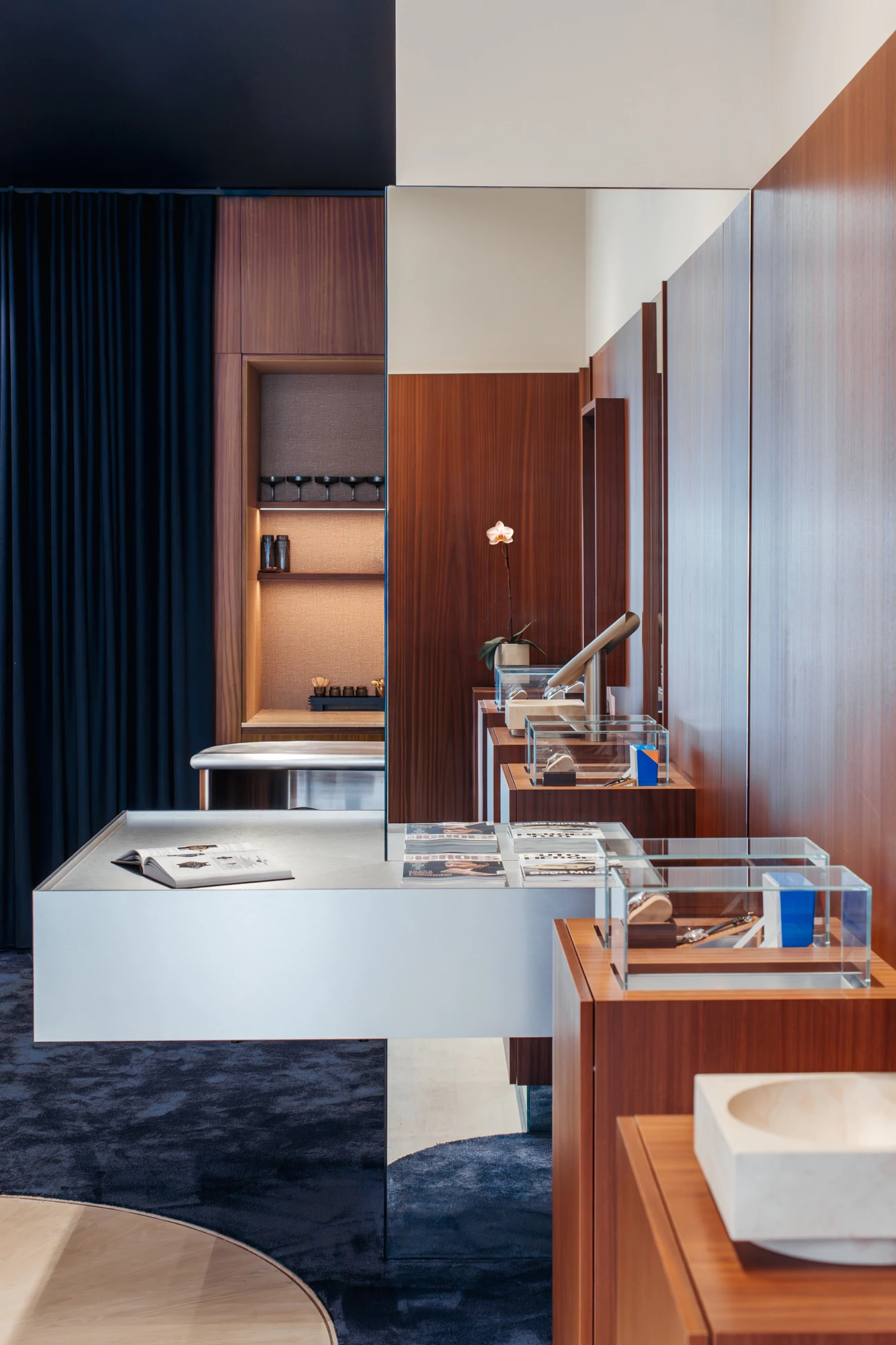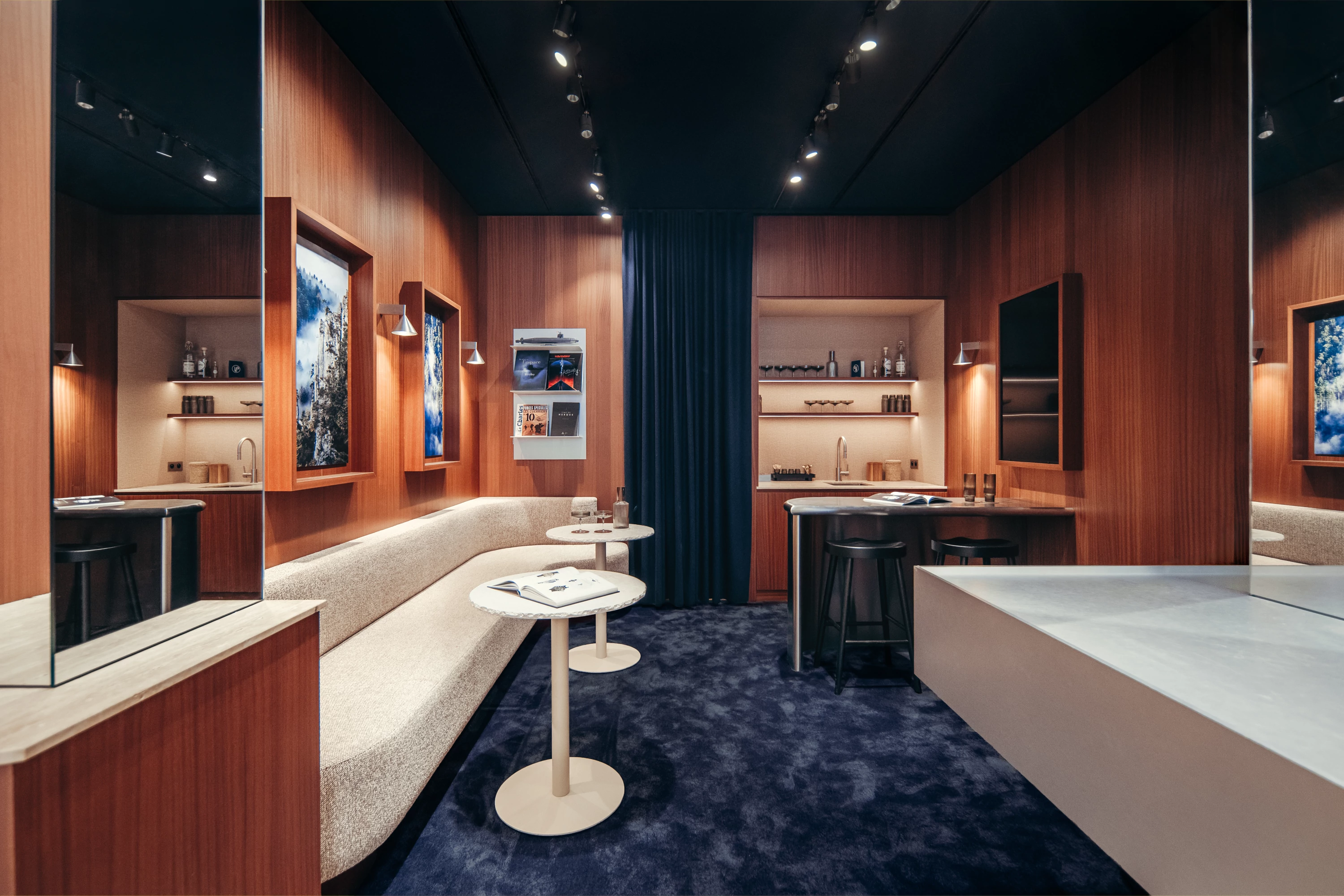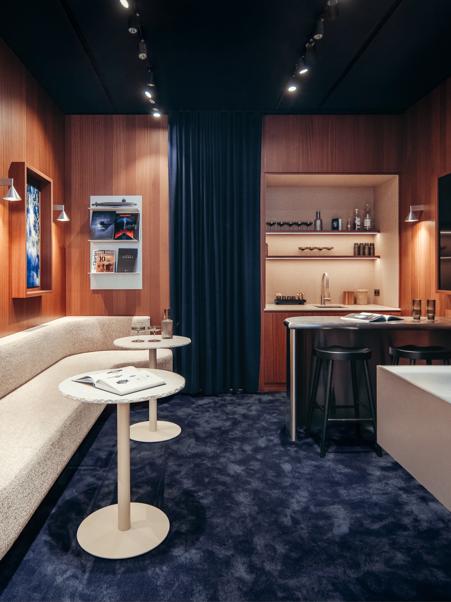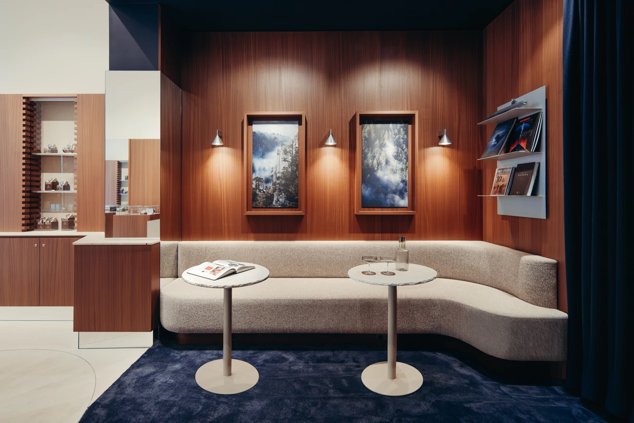Une fois franchi l’espace d’exposition à l’avant de la boutique, où l’ensemble des montres est exposé, le client découvre, au fond, un univers à l’atmosphère plus feutrée. Moquette bleu nuit au sol, banquette arrondie sur mesure et petit espace de restauration avec bar en inox massif... Ce lieu intimiste invite les clients à s’installer, à découvrir, à prendre le temps, et à se sentir comme chez eux, ou comme dans le lounge discret d’un hôtel.