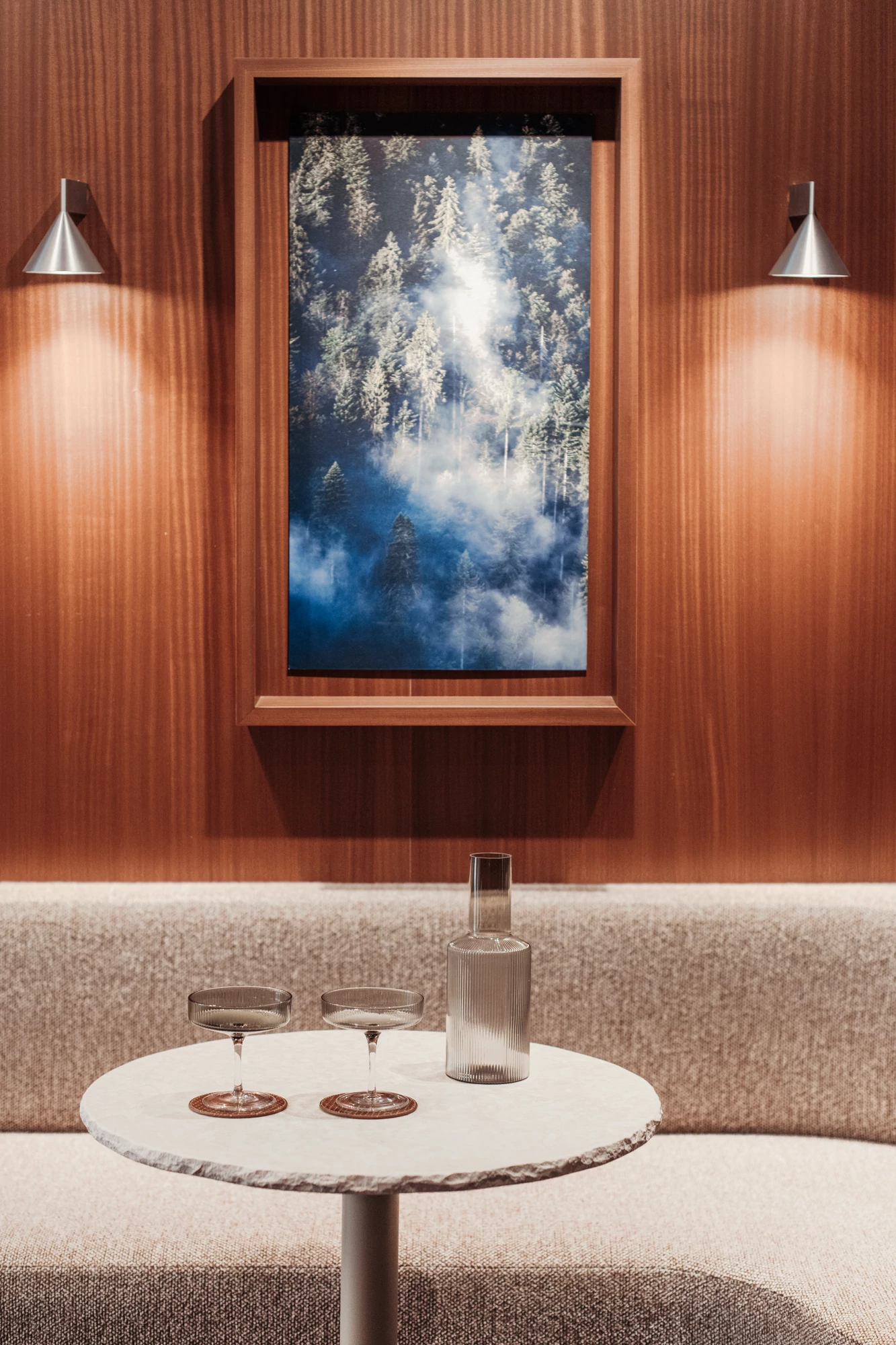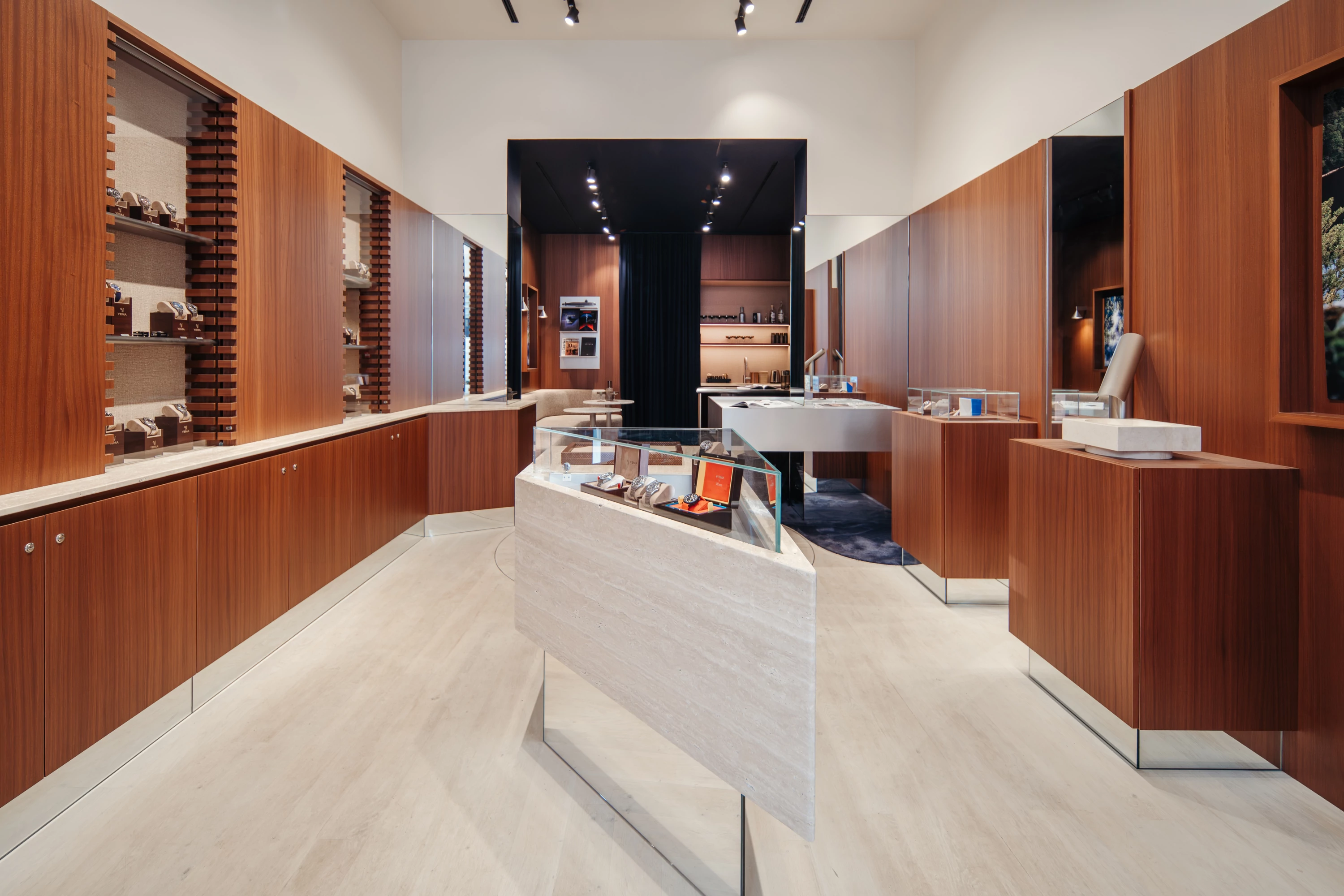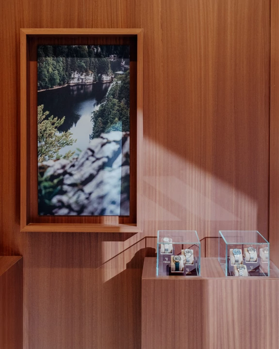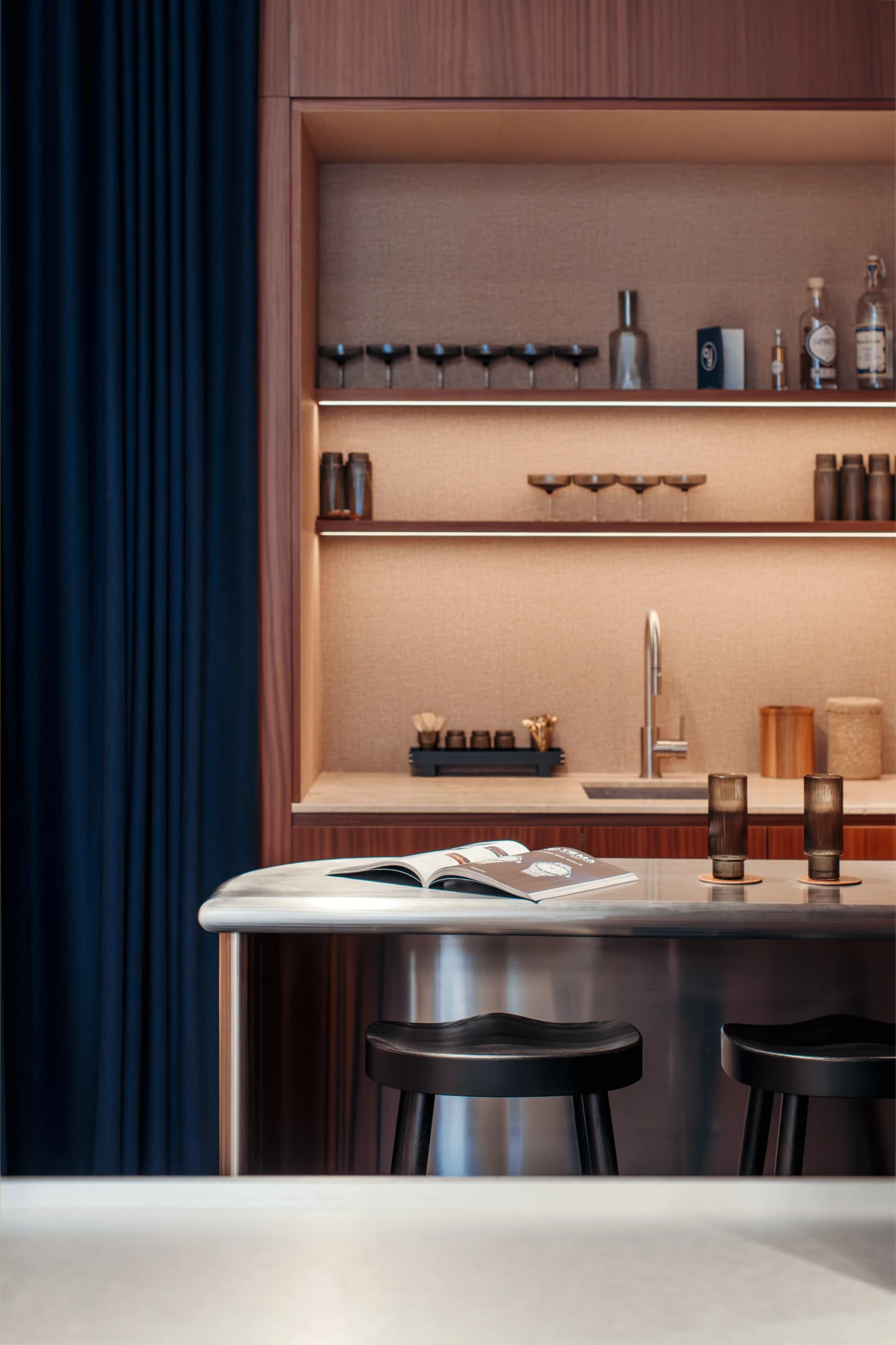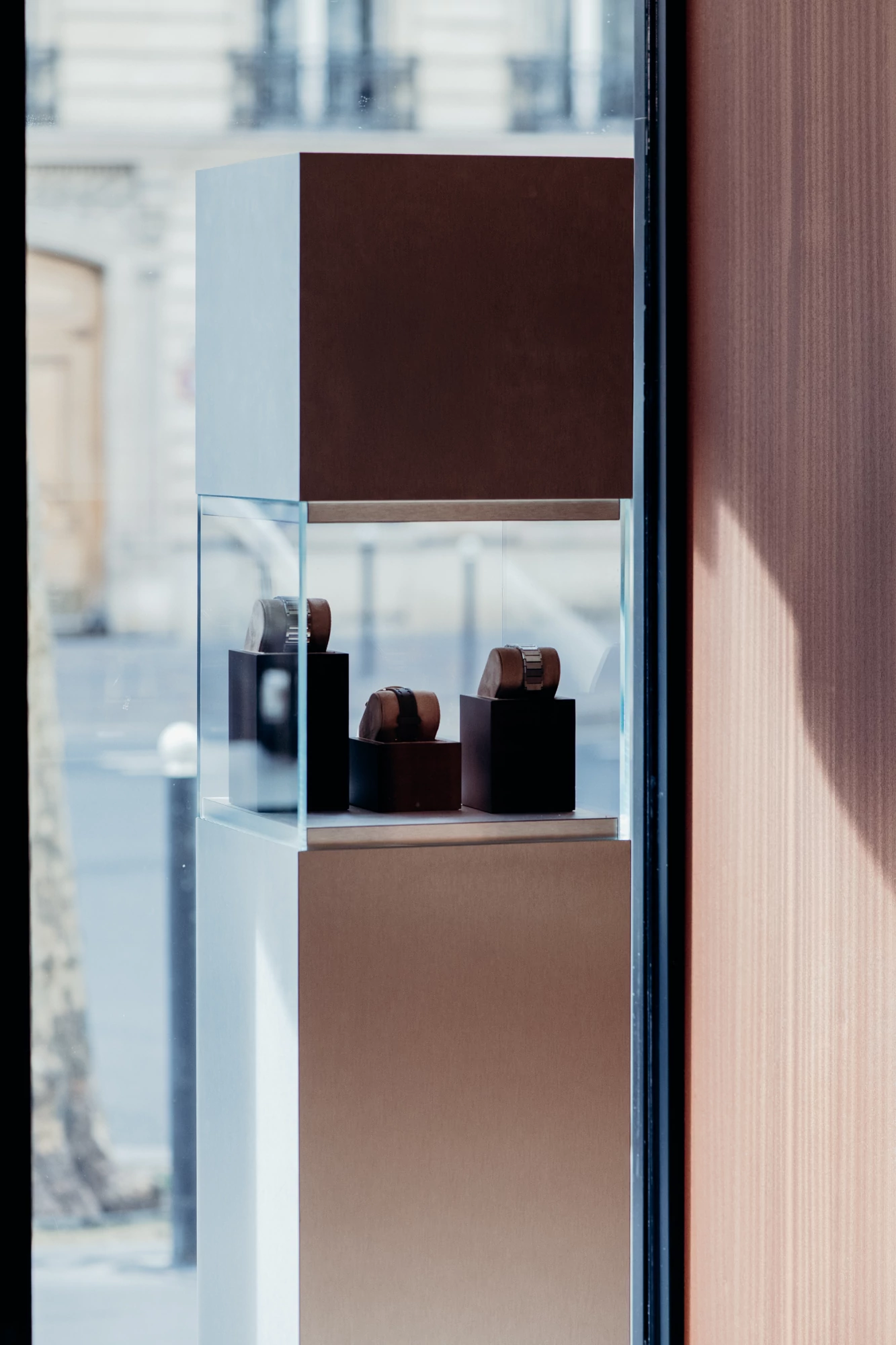 Une fois franchi l’espace d’exposition à l’avant de la boutique, où l’ensemble des montres est exposé, le client découvre, au fond, un univers à l’atmosphère plus feutrée. Moquette bleu nuit au sol, banquette arrondie sur mesure et petit espace de restauration avec bar en inox massif... Ce lieu intimiste invite les clients à s’installer, à découvrir, à prendre le temps, et à se sentir comme chez eux, ou comme dans le lounge discret d’un hôtel.