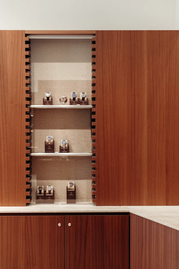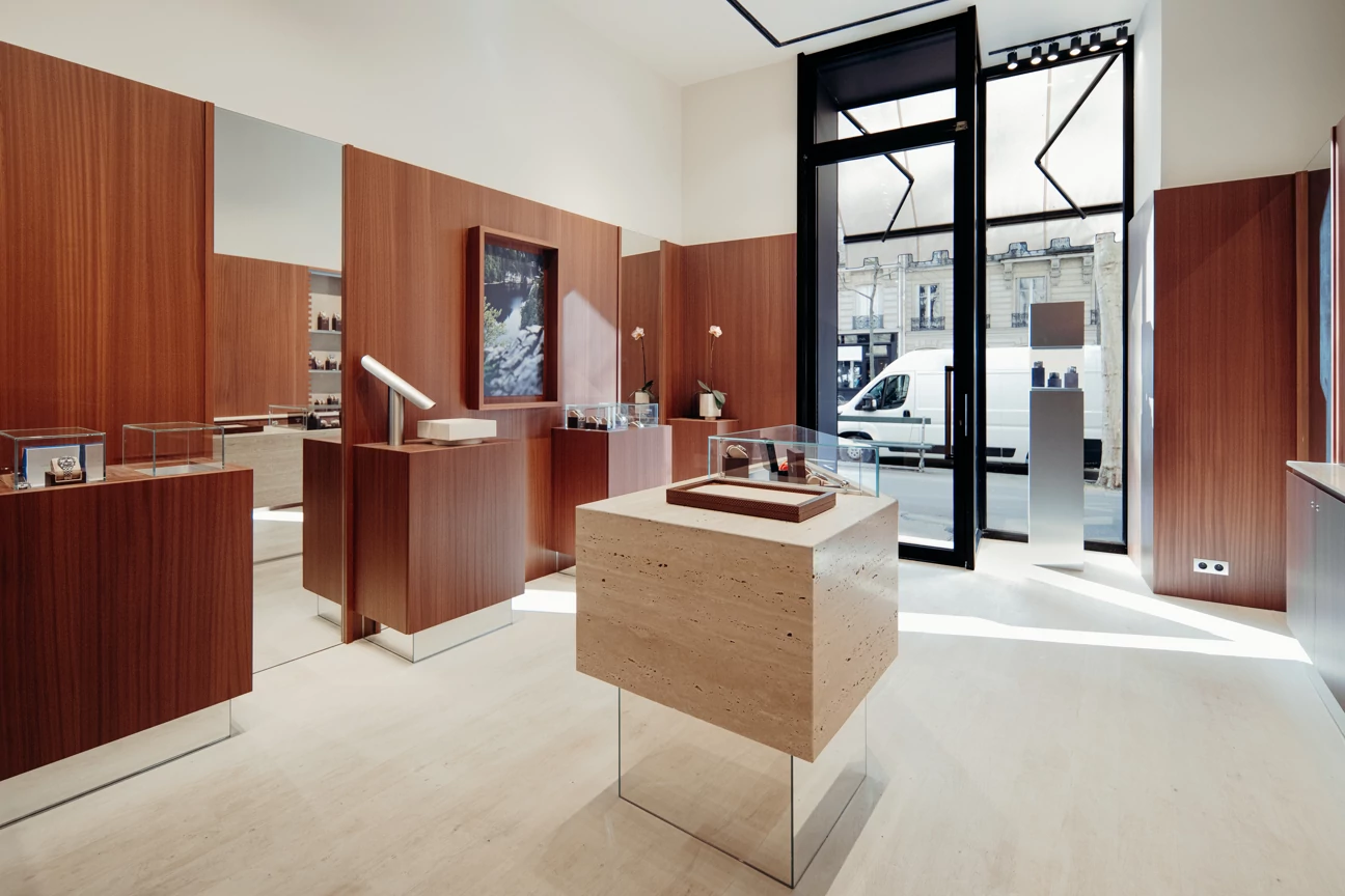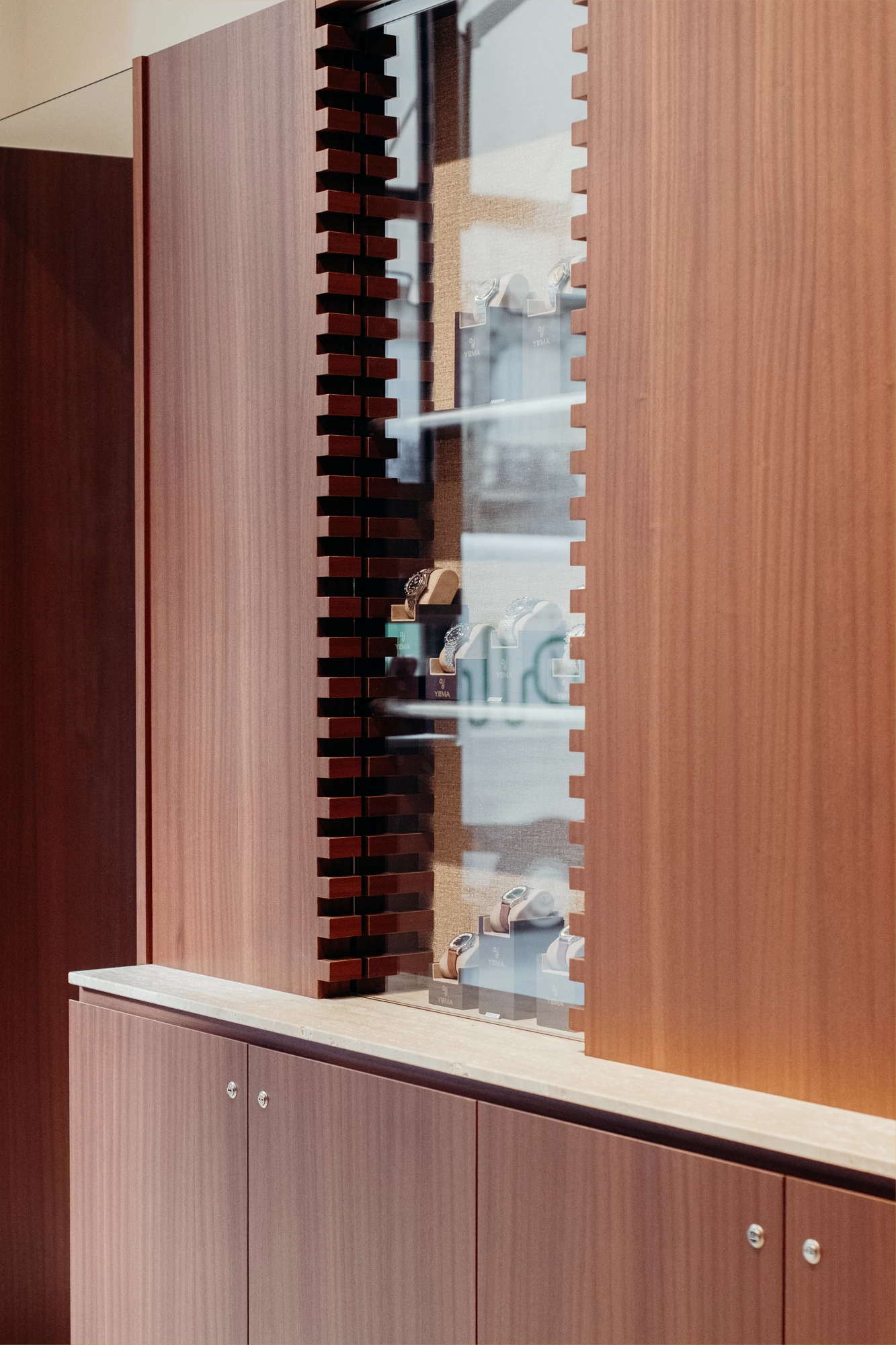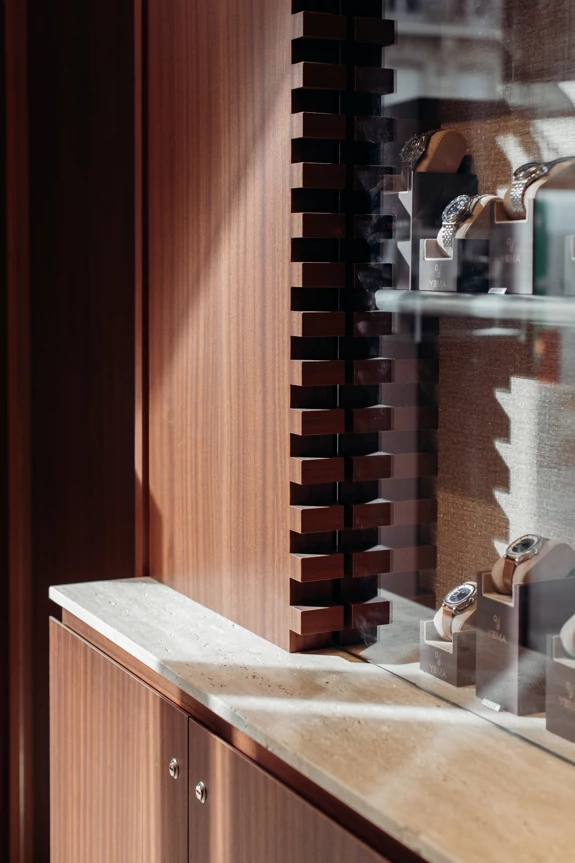 Nous avons donc choisi du noyer, bois noble aux nuances profondes pour l'essentiel de l'agencement de la boutique ainsi que pour le revêtement de certains murs. Il apporte un côté chaleureux, contrastant avec le sol et les autres matériaux choisis : miroir, verre, inox, métal et travertin. Ces combinaisons rappelant les matériaux des montres, viennent souligner l’élégance intemporelle du lieu. Pour mettre en valeur les vitrines, nous avons dessiné un cadre cranté rappelant évoquant les engrenages des mécanismes horlogers.