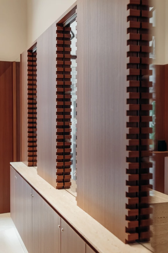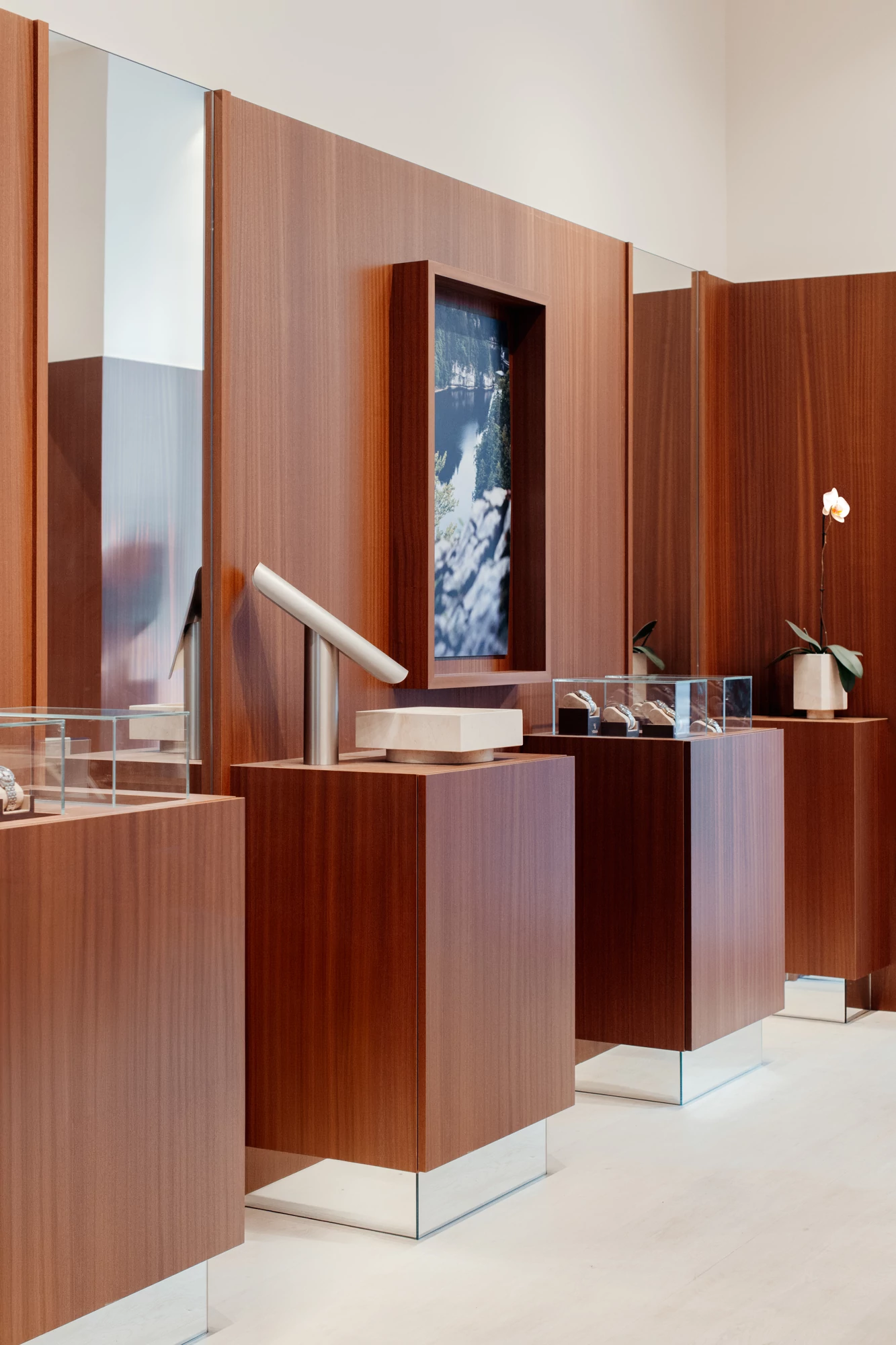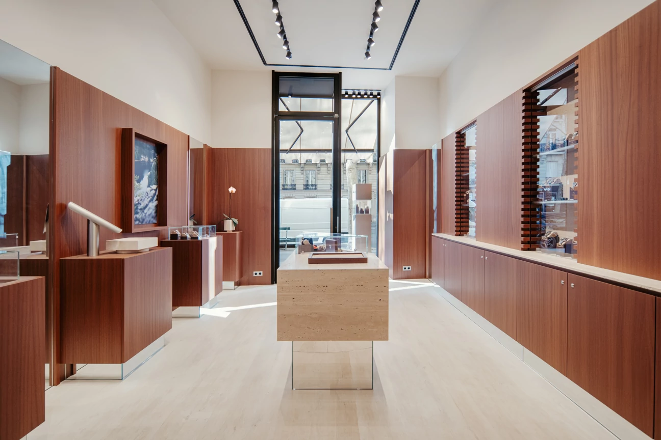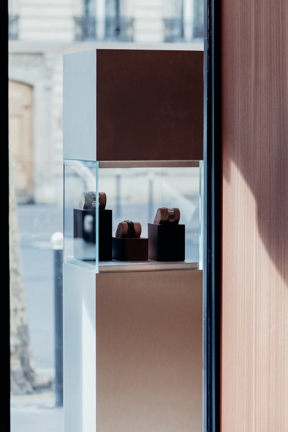 Nous avons donc choisi du noyer, bois noble aux nuances profondes pour l'essentiel de l'agencement de la boutique ainsi que pour le revêtement de certains murs. Il apporte un côté chaleureux, contrastant avec le sol et les autres matériaux choisis : miroir, verre, inox, métal et travertin. Ces combinaisons rappelant les matériaux des montres, viennent souligner l’élégance intemporelle du lieu. Pour mettre en valeur les vitrines, nous avons dessiné un cadre cranté rappelant évoquant les engrenages des mécanismes horlogers.
