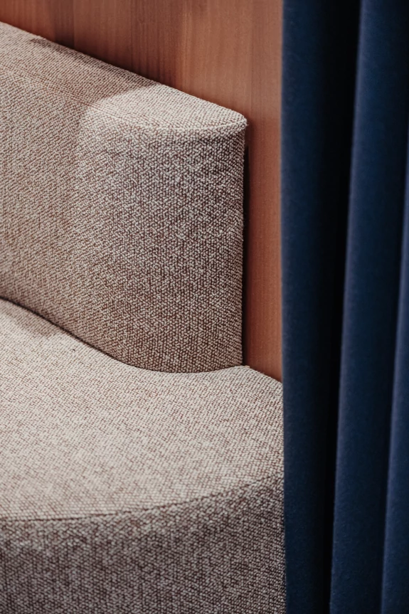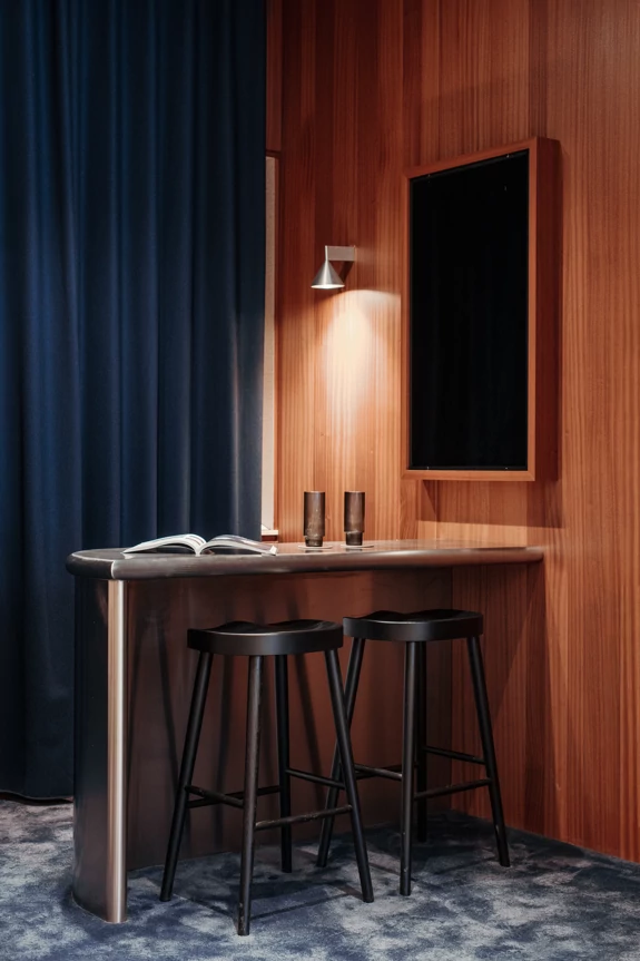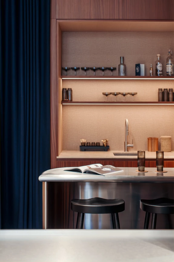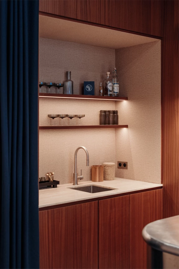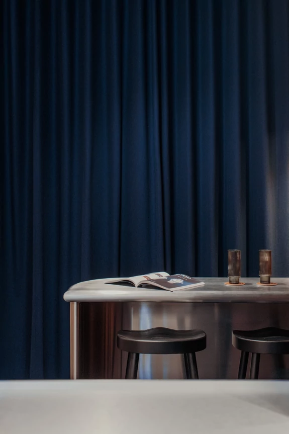 Un rideau en velours épais vient délimiter l’espace réservé au personnel et peut également entièrement masquer la cuisine lorsqu’il est tiré. Il contribue ainsi à renforcer l’atmosphère intimiste du lieu.