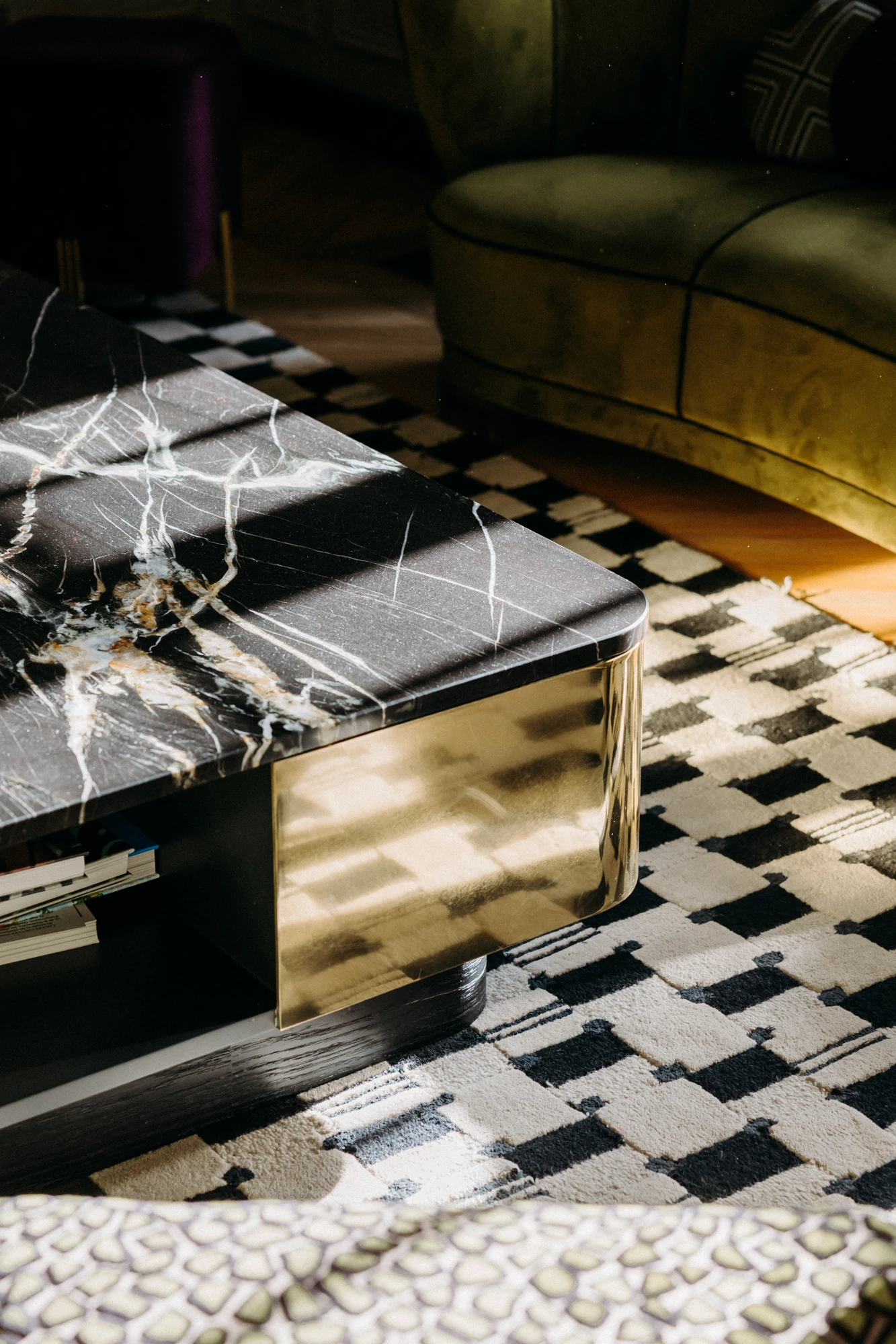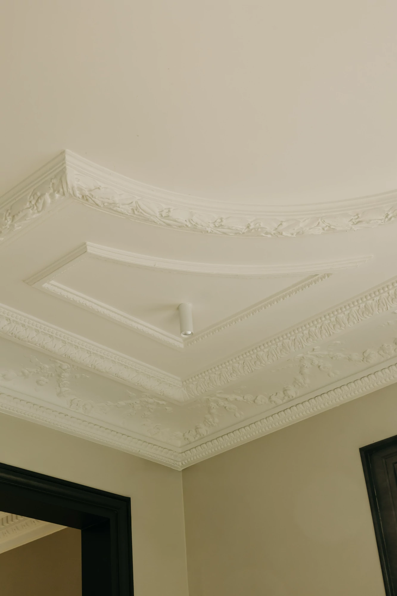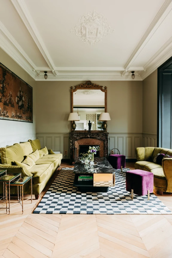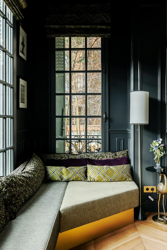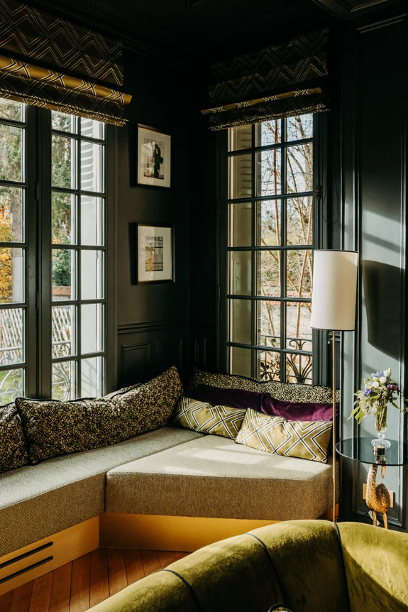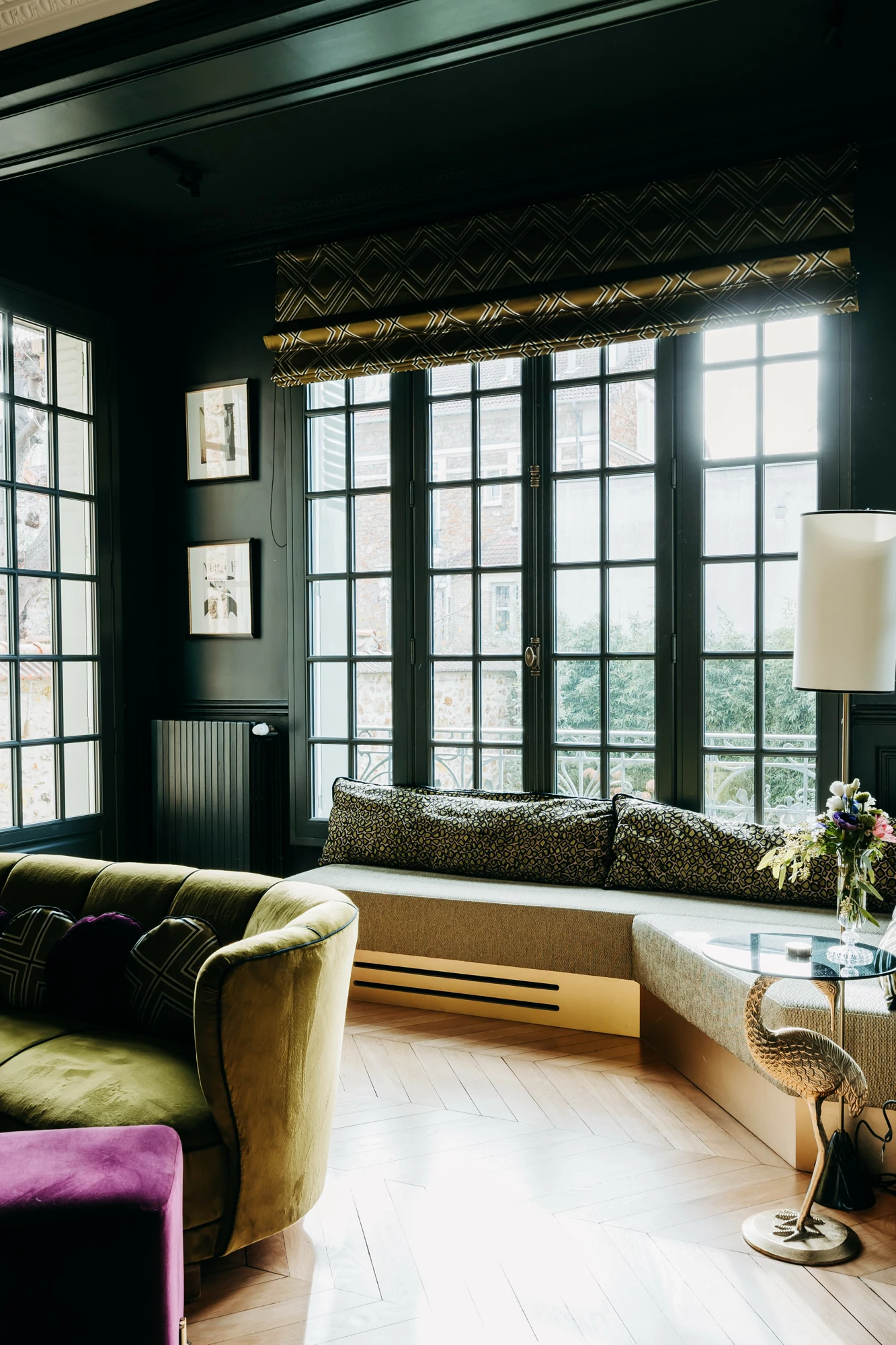 Dans le salon, une alcôve existante, jusqu’alors inutilisée, a été mise en valeur par la création d’une « boîte » noire intégrant une banquette sur mesure devant les fenêtres. Cet espace devient un coin lecture baigné de lumière naturelle, offrant une vue privilégiée sur le jardin arrière. Les plafonniers et les grilles de chauffage au sol existants ont été conservés, tout comme le magnifique plafond d’origine.