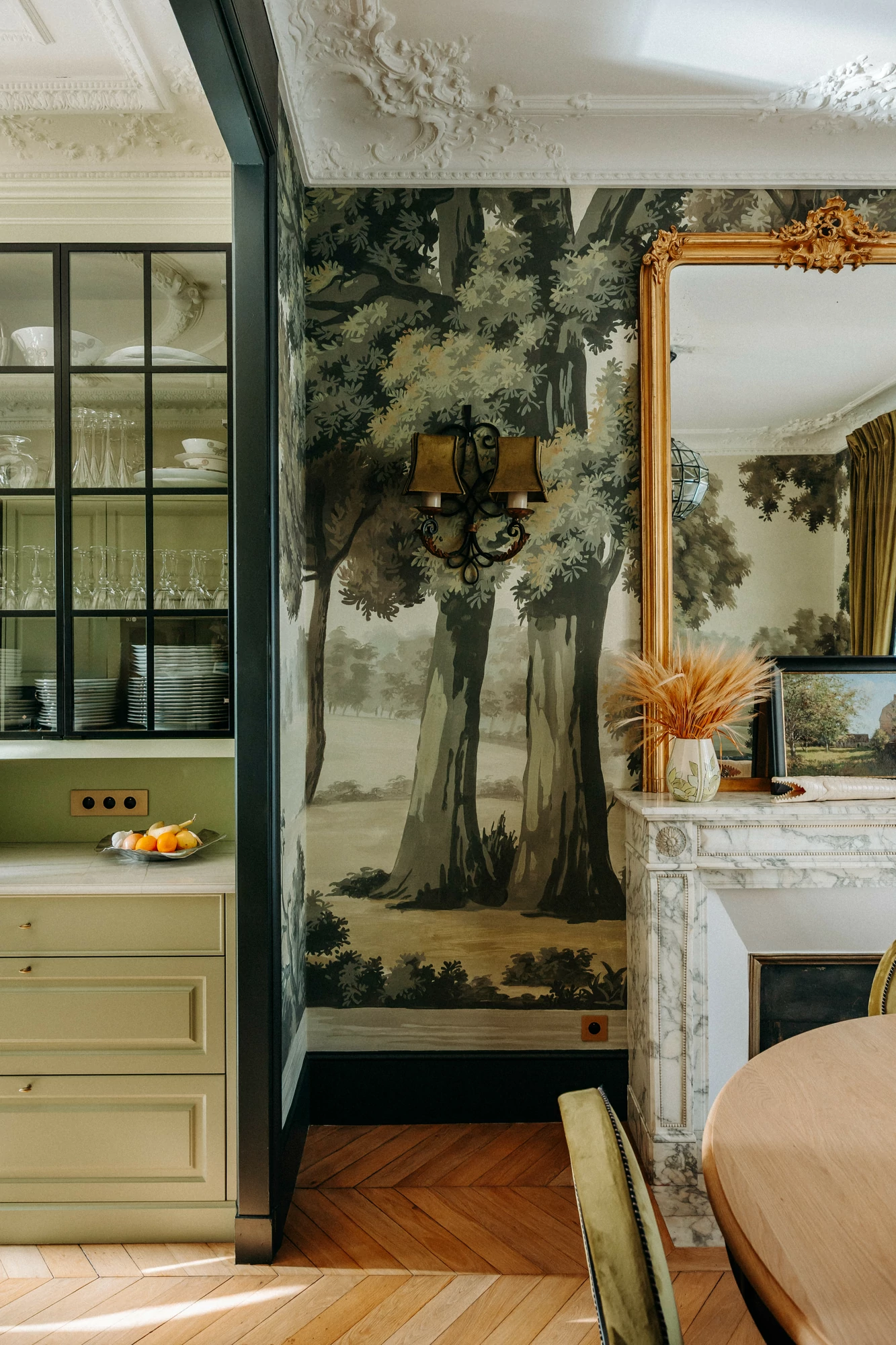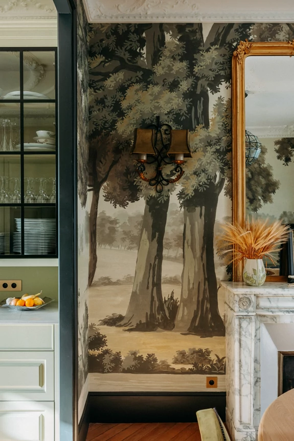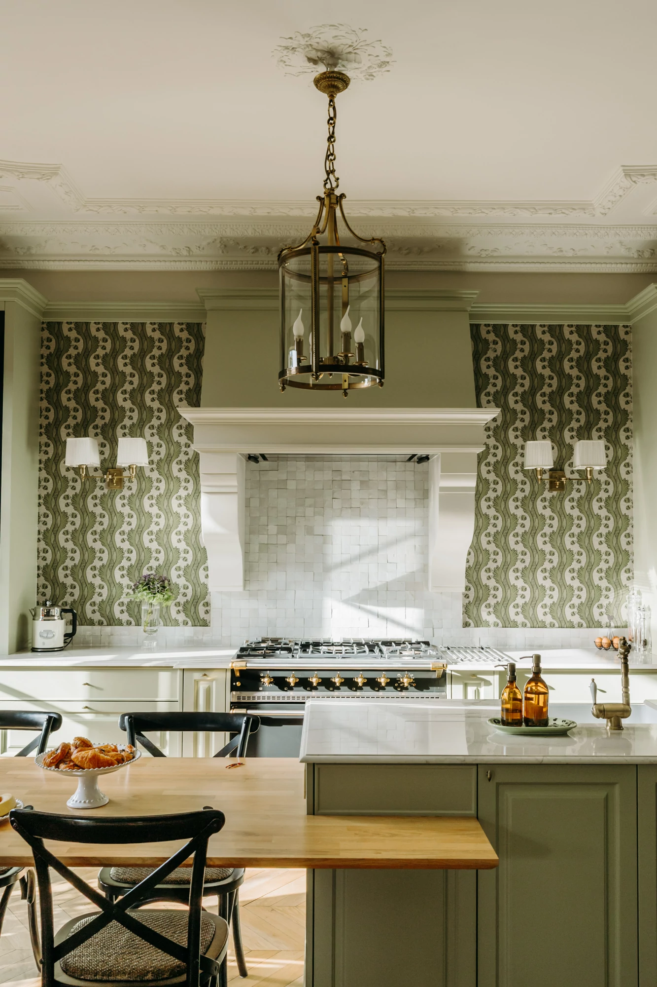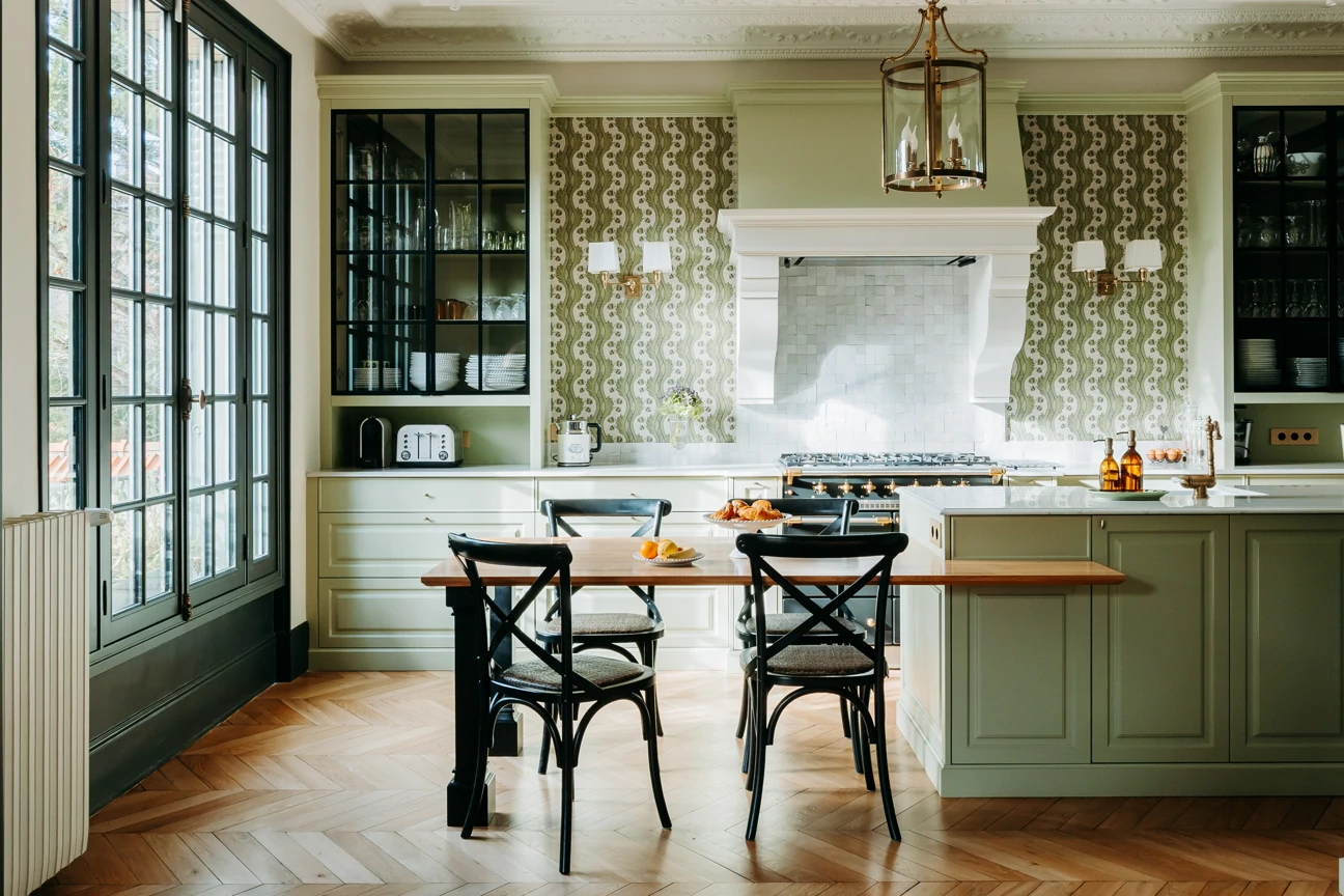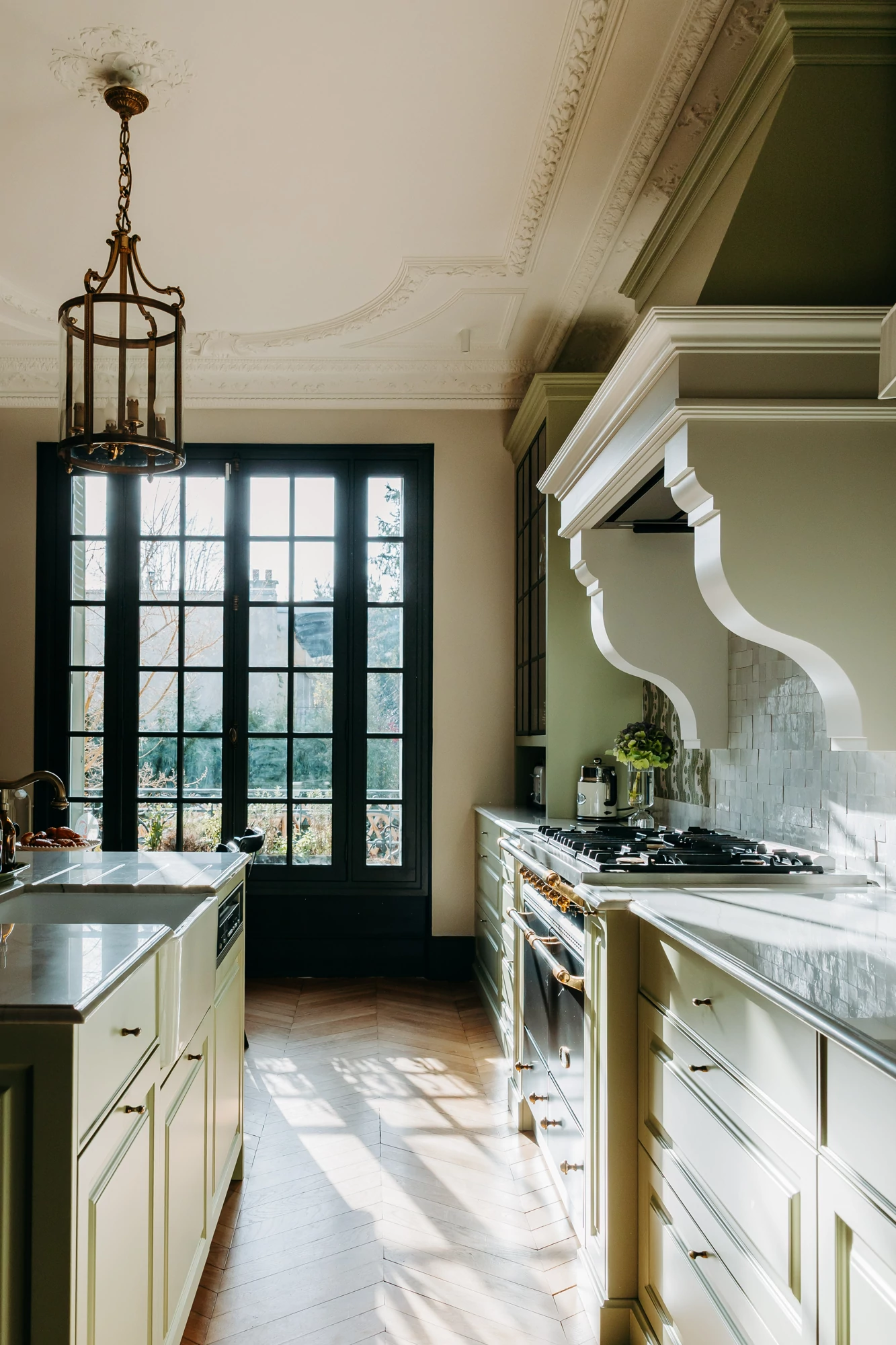 Côté cuisine, une cheminée a été déposée à l’emplacement du piano de cuisson afin d’intégrer la hotte tout en conservant un caractère décoratif fort. Un coffrage mouluré sur mesure a été conçu, donnant l’impression qu’il a toujours fait partie du lieu. Les clients souhaitaient une cuisine au style anglais, richement travaillée : façades moulurées, vaisseliers vitrés, niches dédiées aux électroménagers, plans de travail avec finition en bec de corbin. L’îlot central, véritable cœur de la maison, intègre un évier timbre d’office et une table utilisée au quotidien par la famille. Le superbe plafond existant a été conservé, avec l’intégration discrète de spots au sein des décors. La crédence en zelliges Guarnieri - Tempia et le papier peint viennent parfaire l’ensemble.