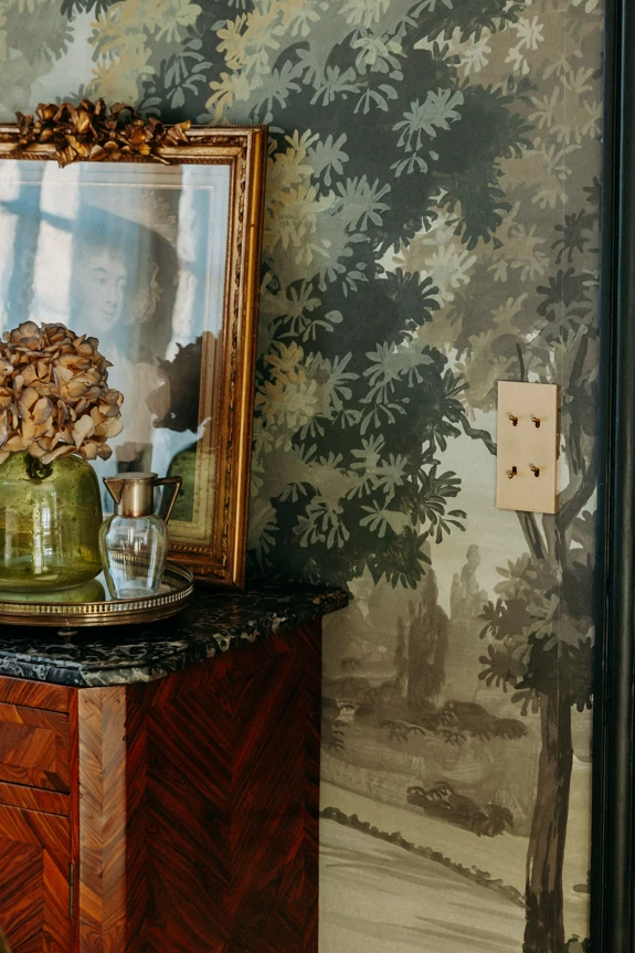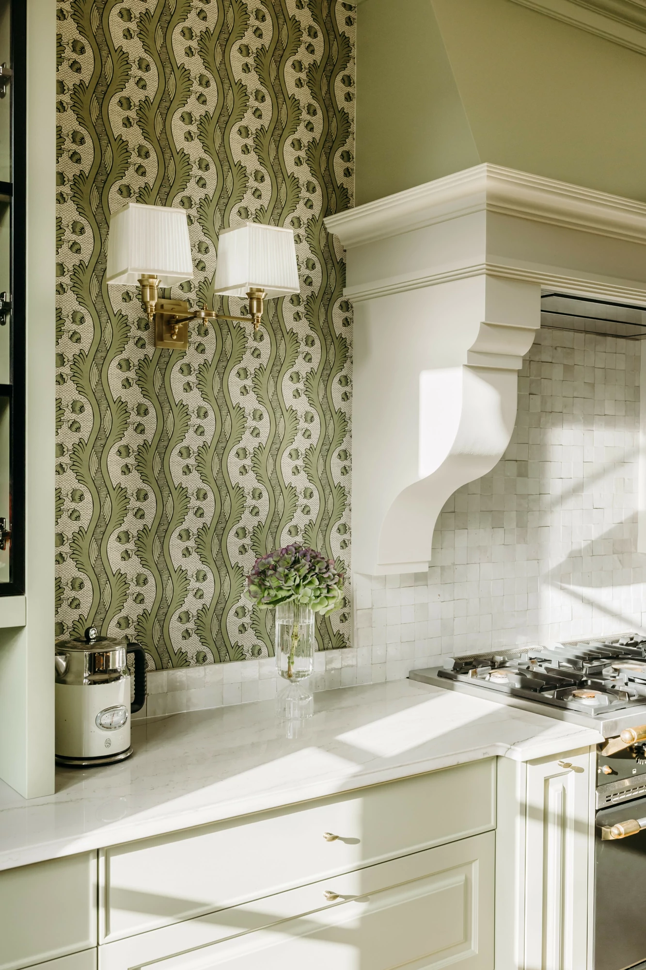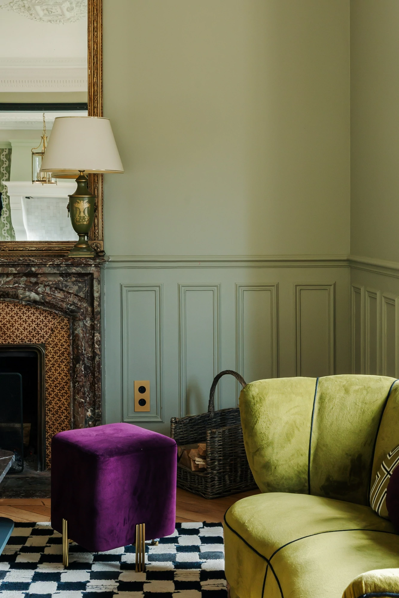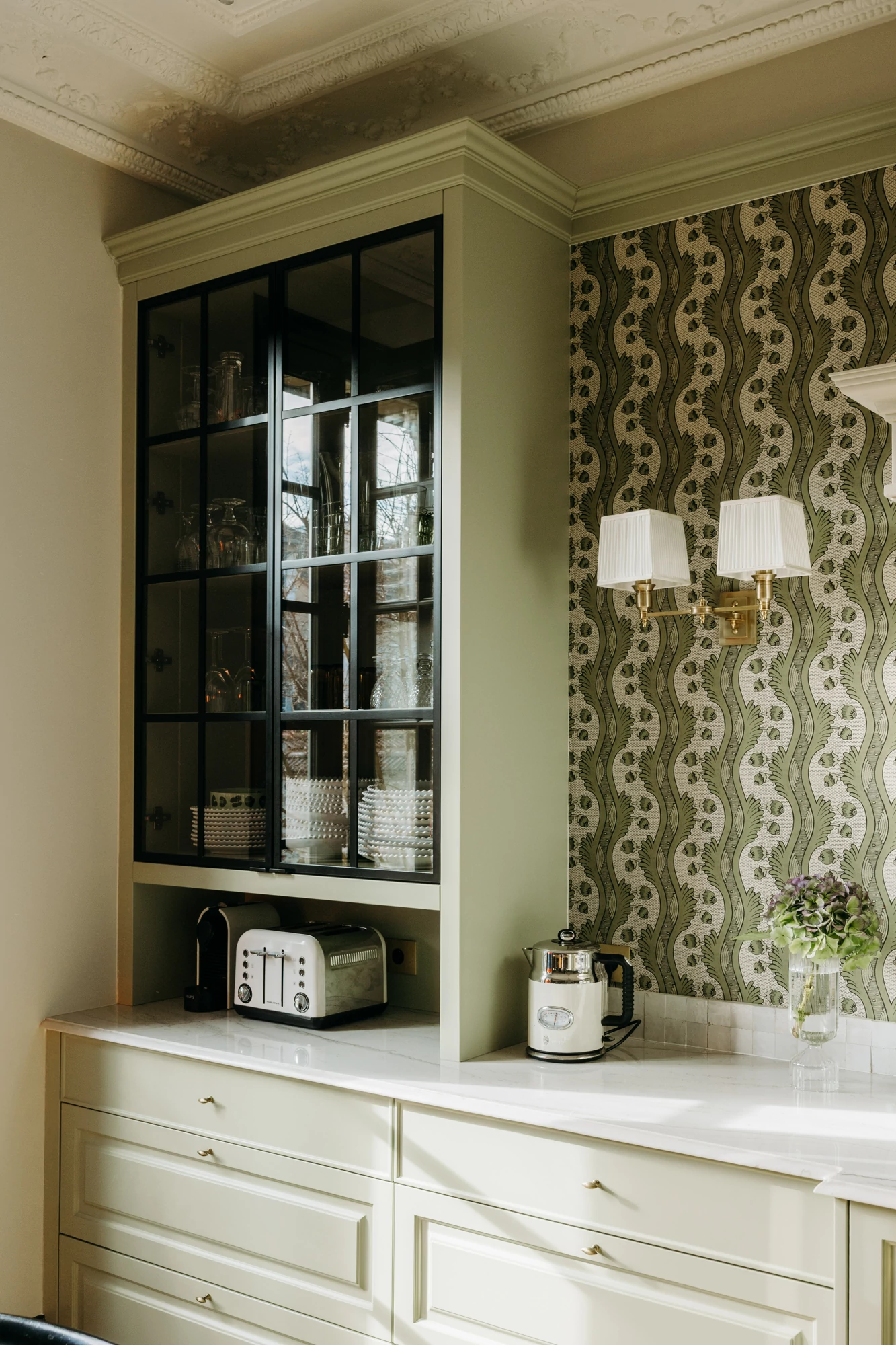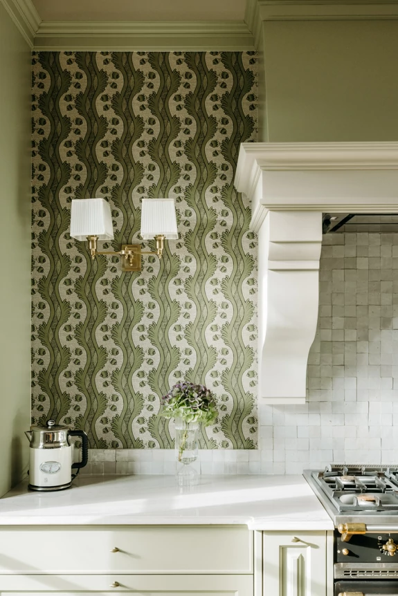 Côté cuisine, une cheminée a été déposée à l’emplacement du piano de cuisson afin d’intégrer la hotte tout en conservant un caractère décoratif fort. Un coffrage mouluré sur mesure a été conçu, donnant l’impression qu’il a toujours fait partie du lieu. Les clients souhaitaient une cuisine au style anglais, richement travaillée : façades moulurées, vaisseliers vitrés, niches dédiées aux électroménagers, plans de travail avec finition en bec de corbin. L’îlot central, véritable cœur de la maison, intègre un évier timbre d’office et une table utilisée au quotidien par la famille. Le superbe plafond existant a été conservé, avec l’intégration discrète de spots au sein des décors. La crédence en zelliges Guarnieri - Tempia et le papier peint viennent parfaire l’ensemble.