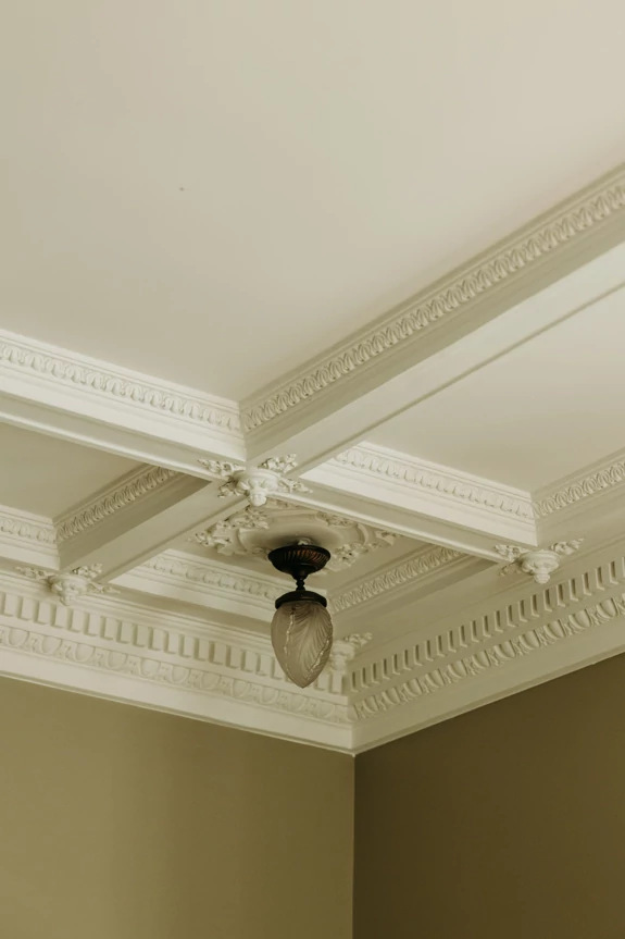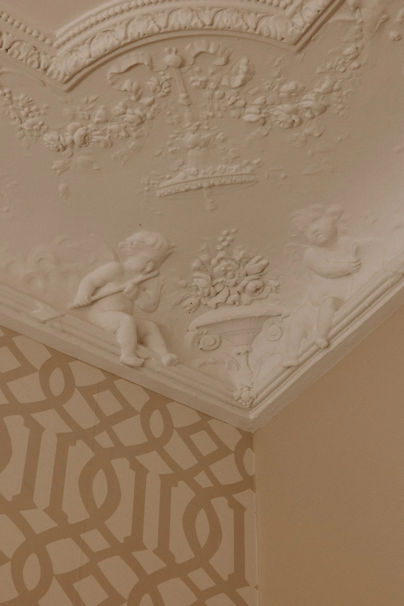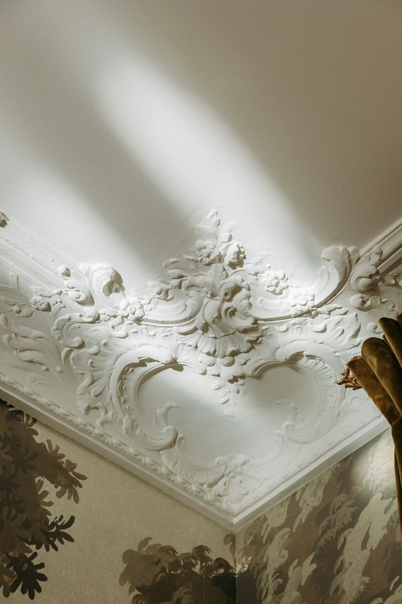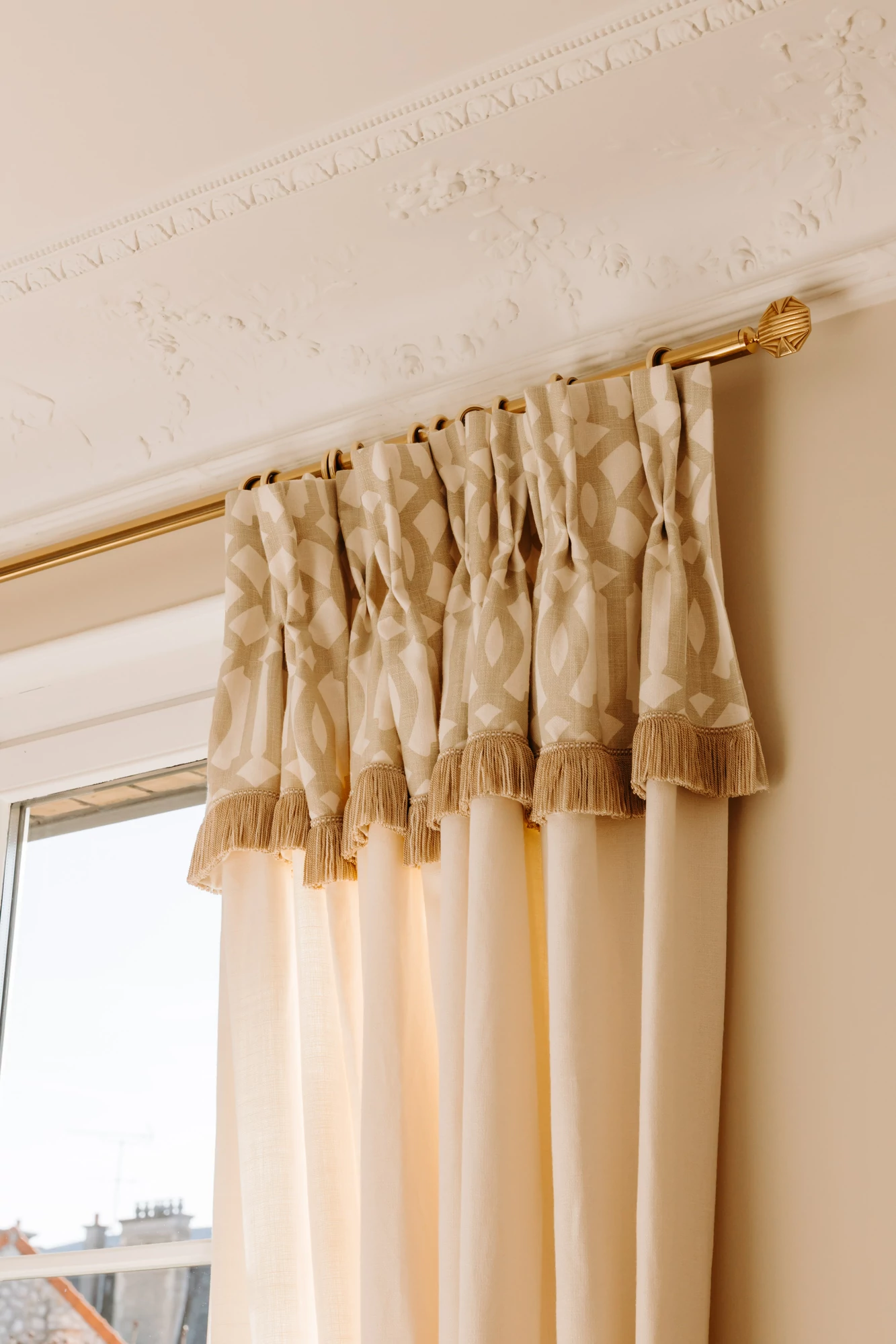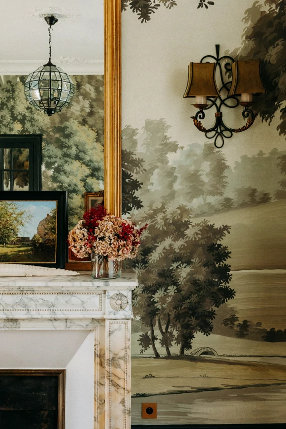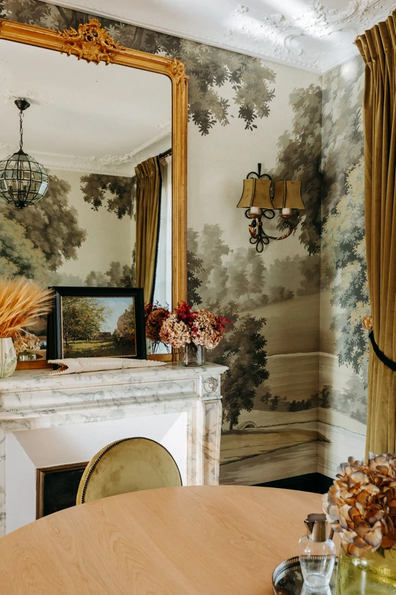 Côté cuisine, une cheminée a été déposée à l’emplacement du piano de cuisson afin d’intégrer la hotte tout en conservant un caractère décoratif fort. Un coffrage mouluré sur mesure a été conçu, donnant l’impression qu’il a toujours fait partie du lieu. Les clients souhaitaient une cuisine au style anglais, richement travaillée : façades moulurées, vaisseliers vitrés, niches dédiées aux électroménagers, plans de travail avec finition en bec de corbin. L’îlot central, véritable cœur de la maison, intègre un évier timbre d’office et une table utilisée au quotidien par la famille. Le superbe plafond existant a été conservé, avec l’intégration discrète de spots au sein des décors. La crédence en zelliges Guarnieri - Tempia et le papier peint viennent parfaire l’ensemble.