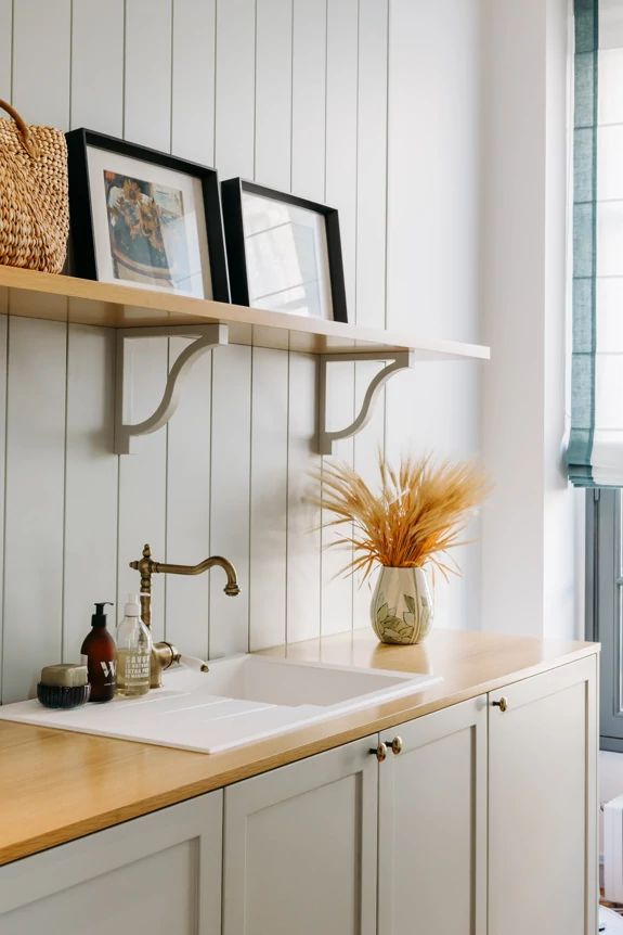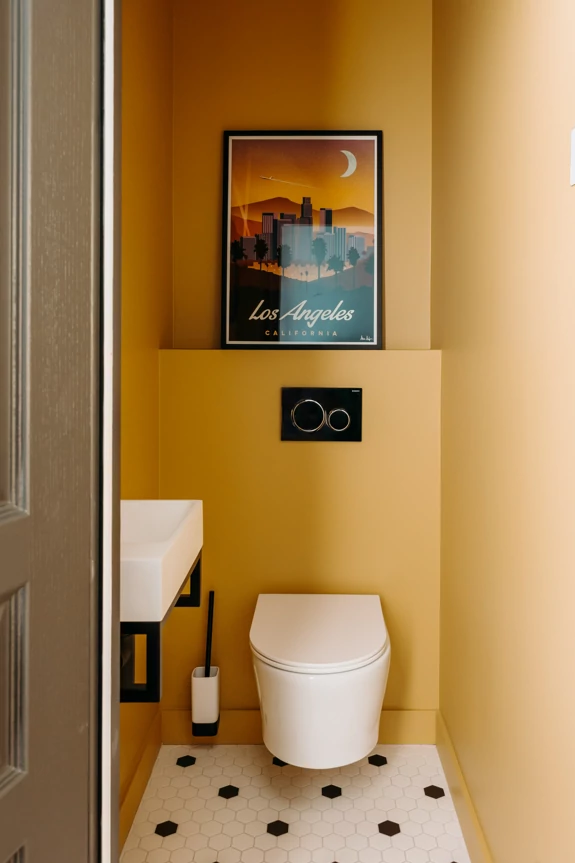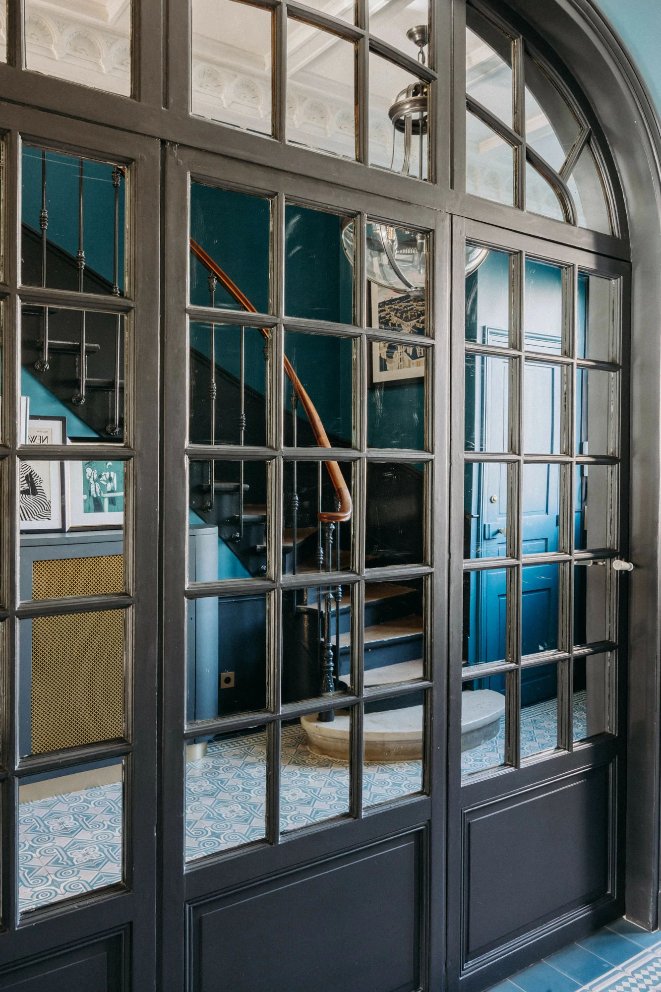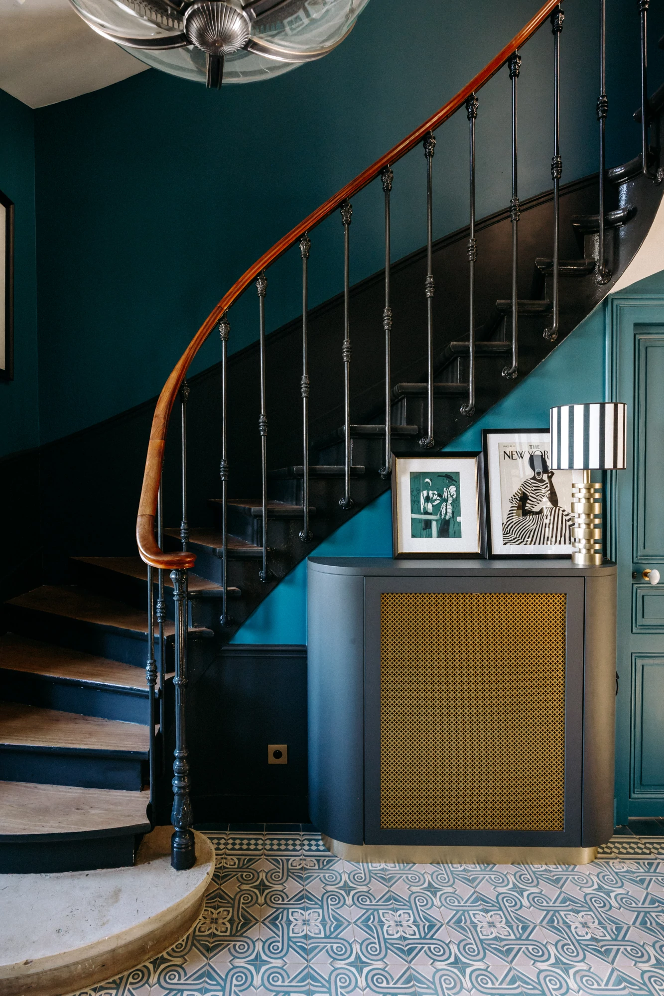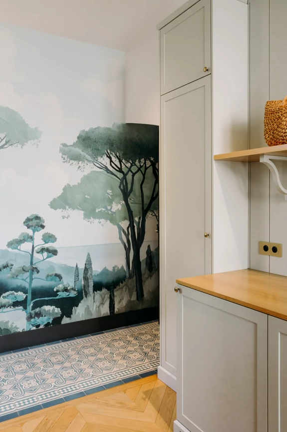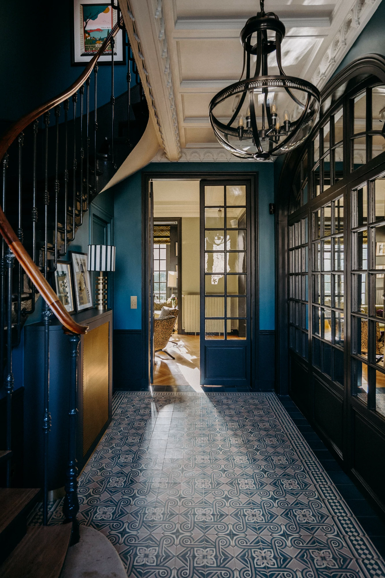 L’entrée de cette maison est mise en valeur grâce à différents détails : des miroirs qui agrandissent l’espace, de la couleur, et des détails repensés avec soin comme les carreaux de ciment. Le motif d’origine a été conservé afin de préserver l’histoire du lieu, tout en revisitant les couleurs pour les accorder au projet. Ce motif se prolonge dans les WC et la boot-room. Le cache-radiateur a également été réalisé sur mesure.