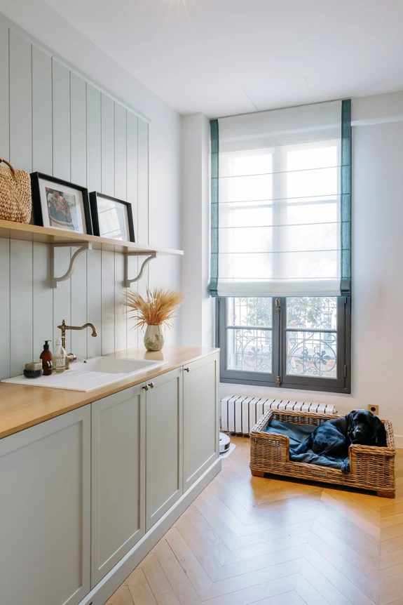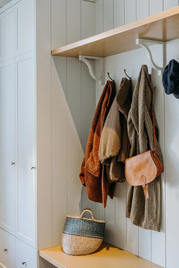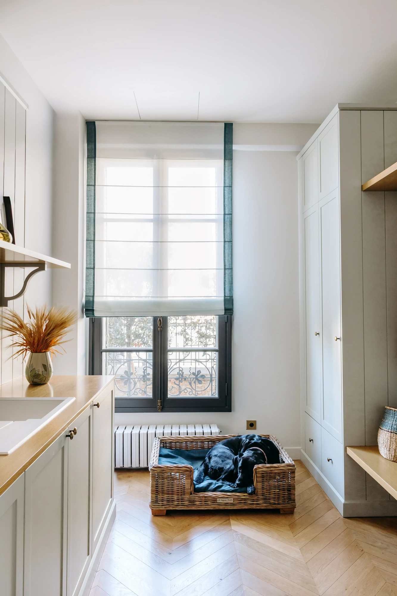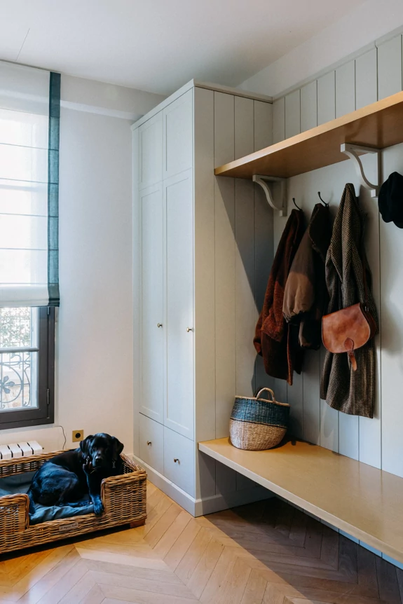 L’ancienne cuisine a été reconvertie en boot-room. Cet espace constitue une entrée dédiée aux occupants de la maison. Pensée comme une zone fonctionnelle du quotidien, elle permet de se décharger facilement grâce à de nombreux rangements sur mesure : banc, patères, étagères et placards. Un « tapis » en carreaux de ciment, identique à ceux de l’entrée principale, structure l’espace tandis qu’un parquet en point de Hongrie apporte confort et chaleur au reste de la pièce.