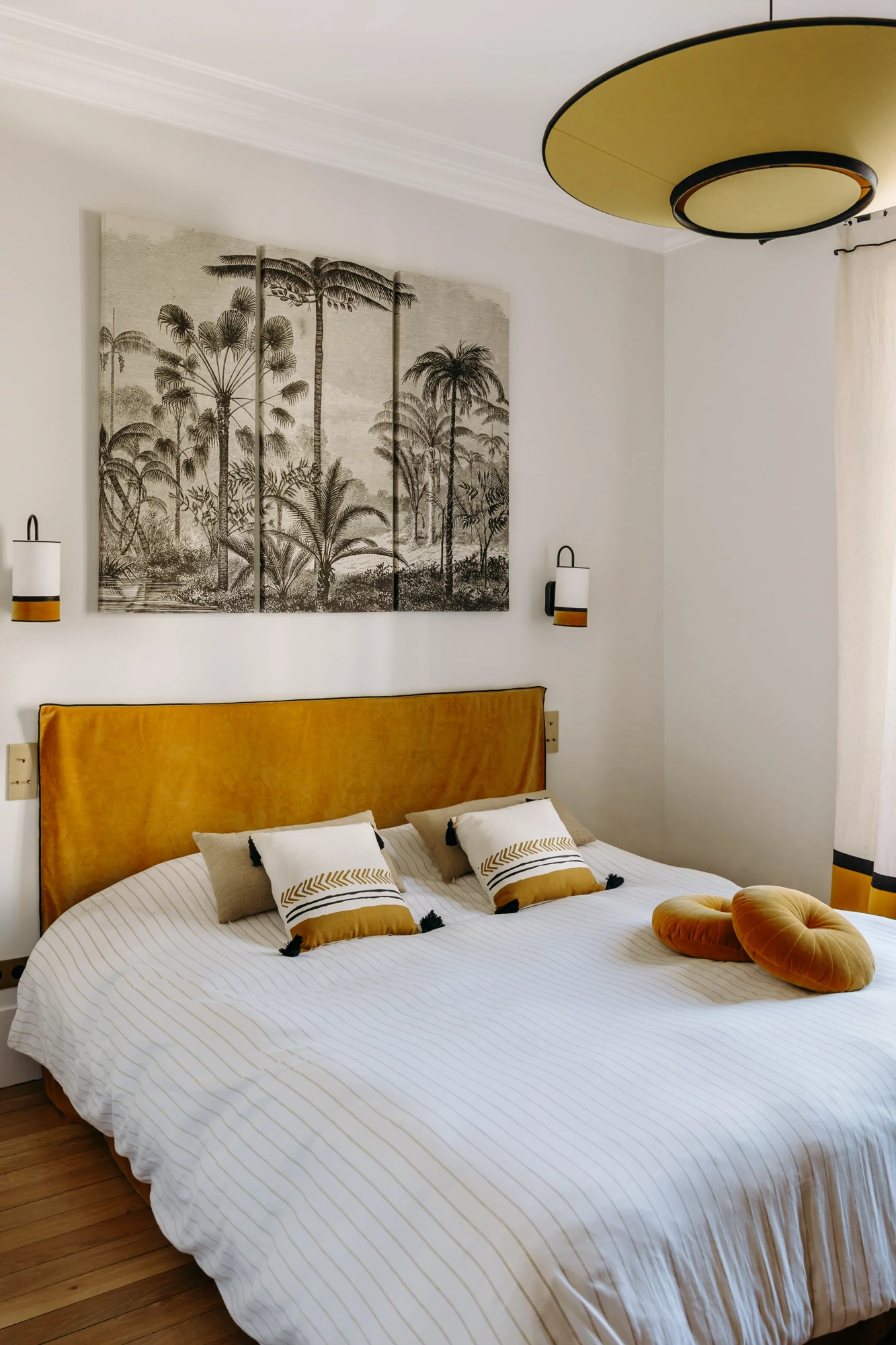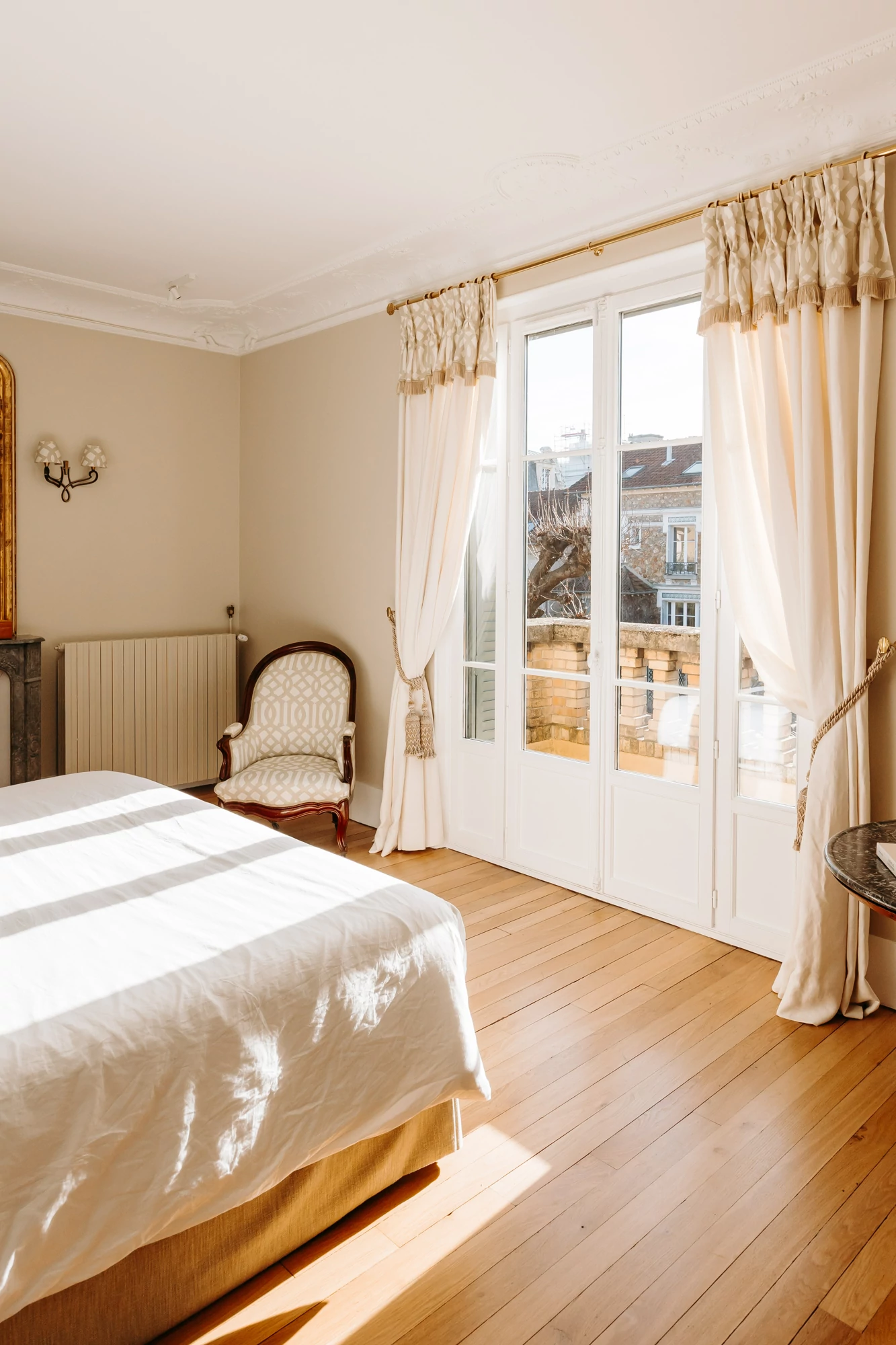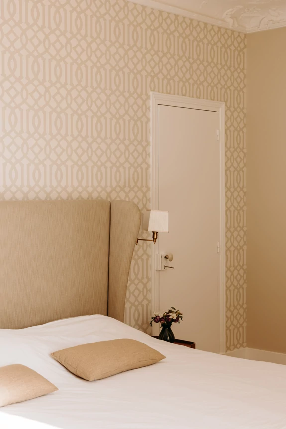 Les étages sont accessibles directement depuis l’entrée, grâce au grand escalier d’origine réhabilité. Le premier niveau donne directement accès à la chambre parentale dont les corniches d’origine ont été conservées et mises en valeur. Un papier peint vient souligner le caractère élégant et intime de la chambre.