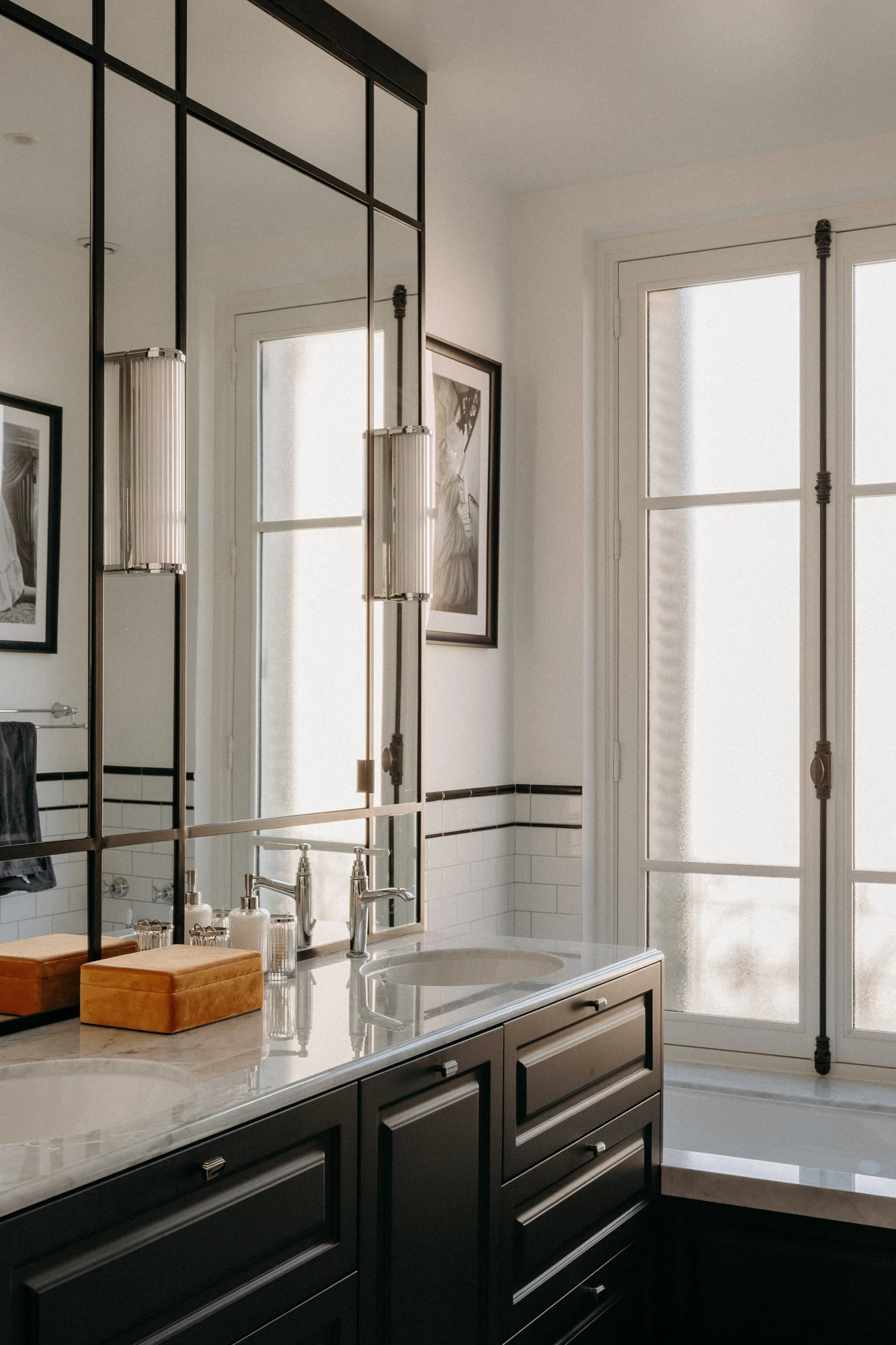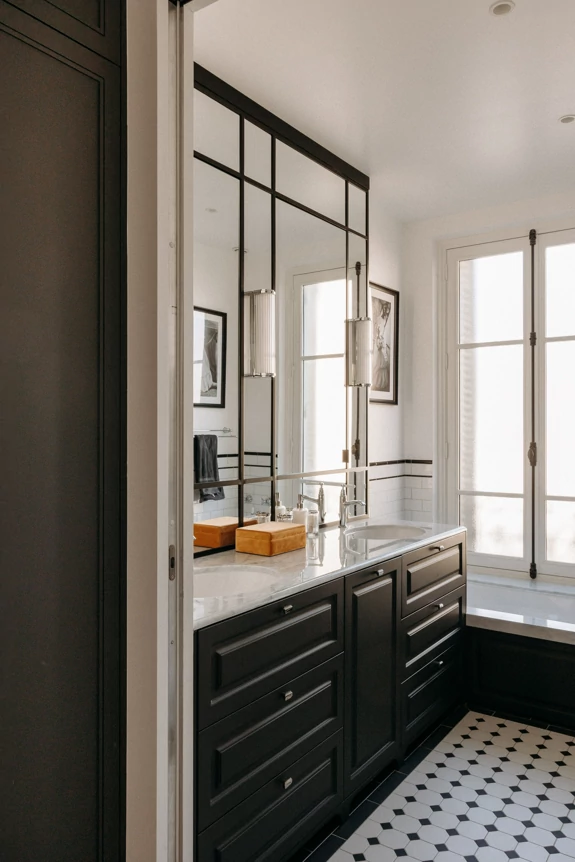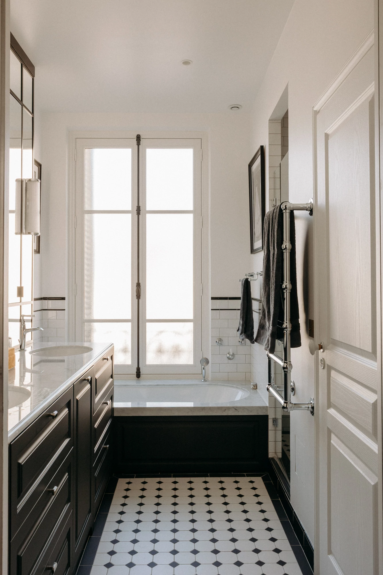 La salle de bain adopte une palette noire et blanche, avec un calepinage mural et au sol particulièrement travaillé. La baignoire est habillée d’un tablier en bois mouluré, en rappel des portes du meuble vasque. Des placards miroirs dissimulent les éléments techniques pour une lecture plus épurée de l’espace.