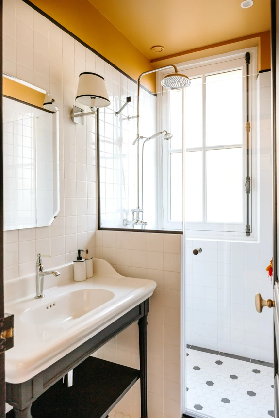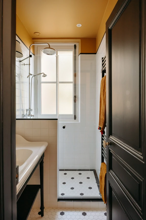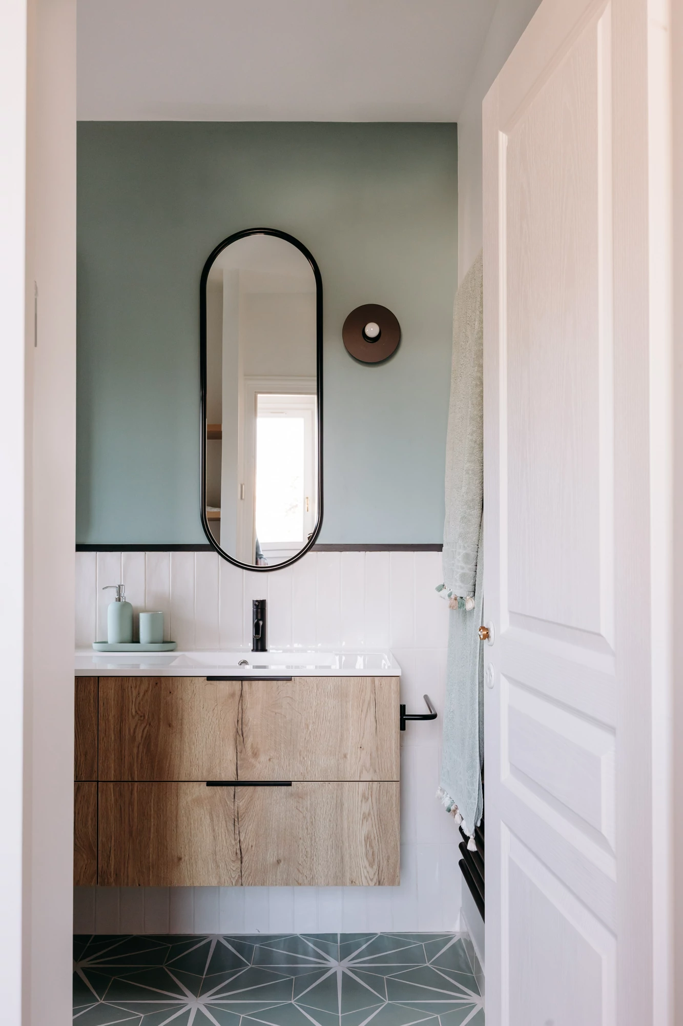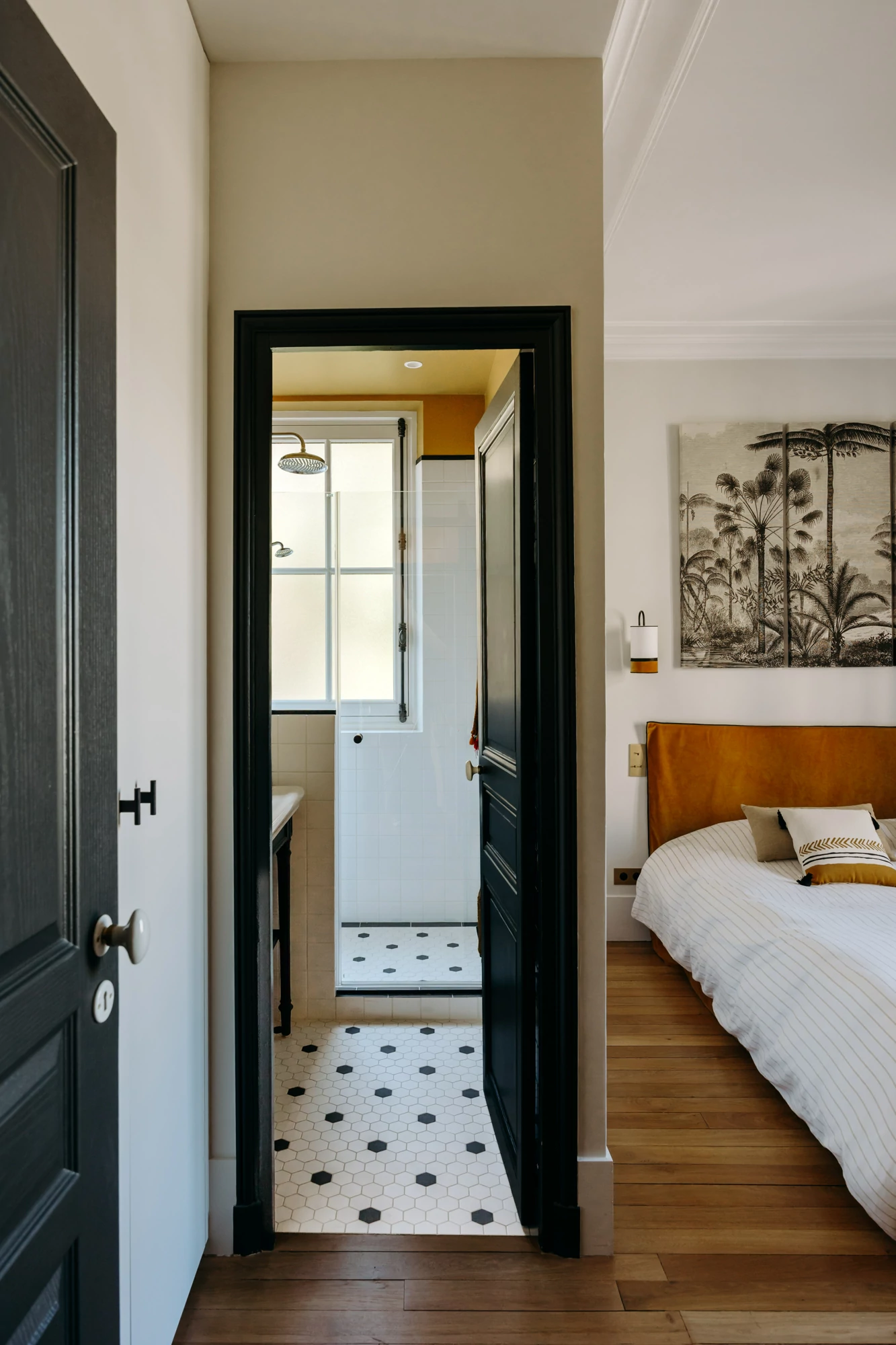 La salle de bain adopte une palette noire et blanche, avec un calepinage mural et au sol particulièrement travaillé. La baignoire est habillée d’un tablier en bois mouluré, en rappel des portes du meuble vasque. Des placards miroirs dissimulent les éléments techniques pour une lecture plus épurée de l’espace.