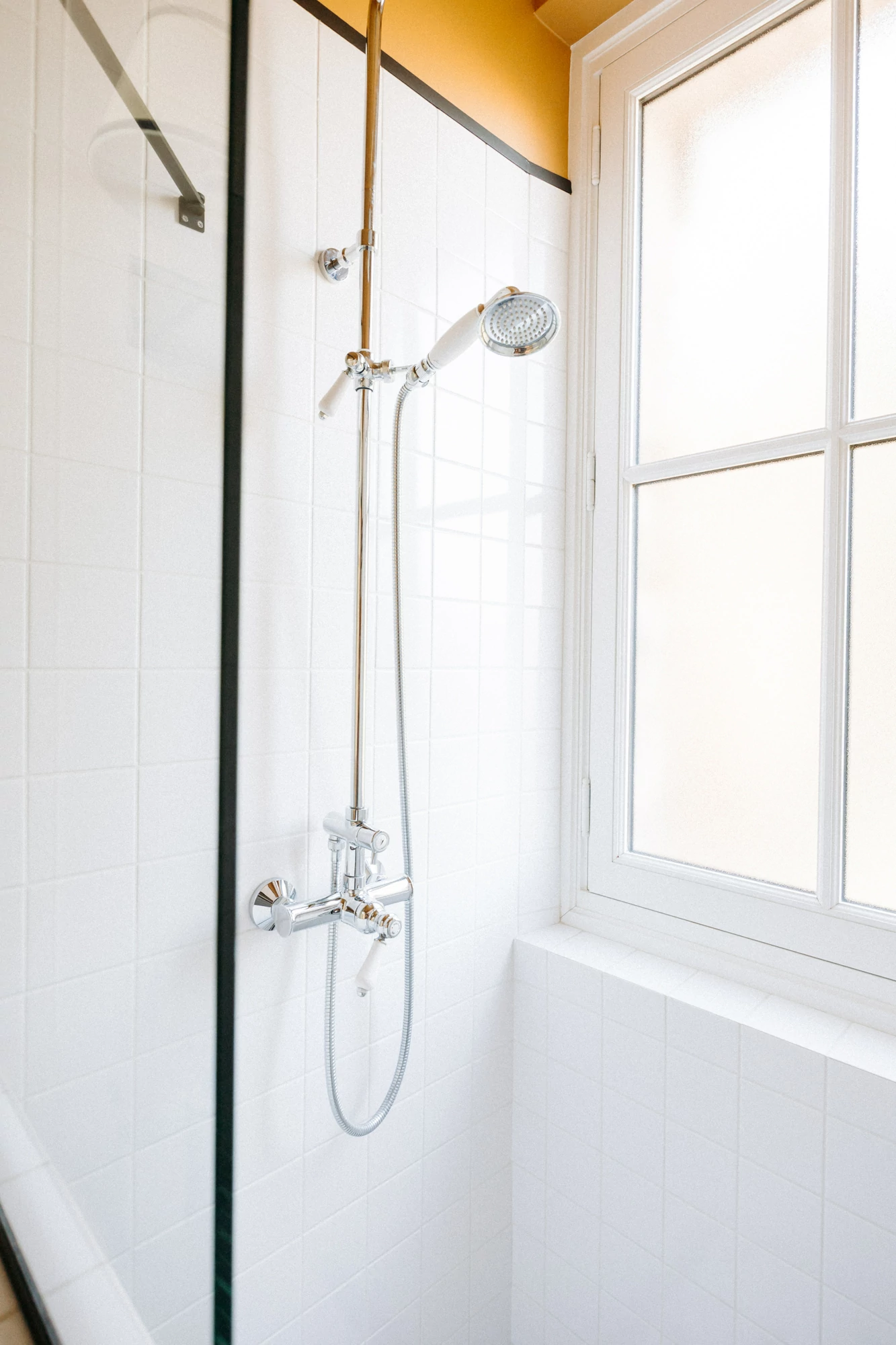 La deuxième pièce de l’étage accueille à la fois une suite invités et un bureau utilisé au quotidien. La cheminée existante a été déposée afin de libérer l’espace nécessaire à l’installation d’un grand lit et d’un bureau confortable. Une salle de douche a été créée à la place de deux anciens dressings.