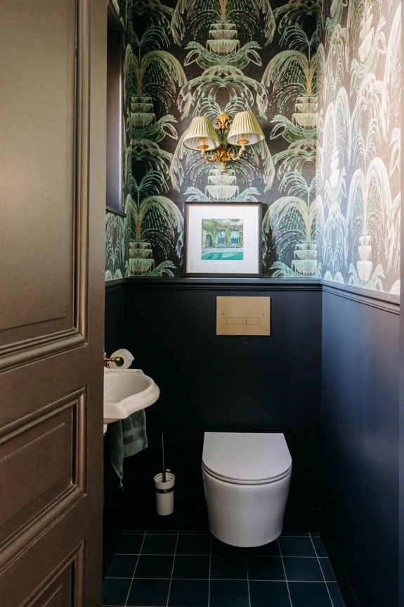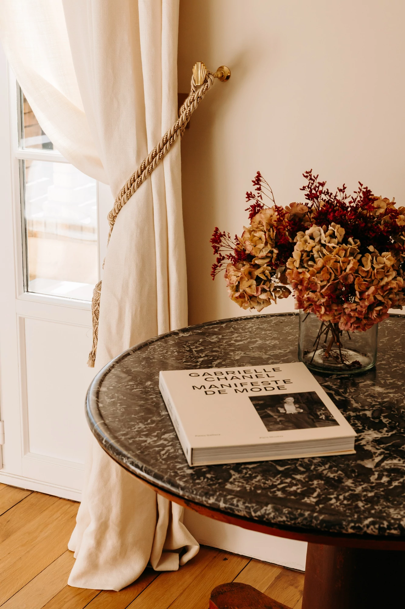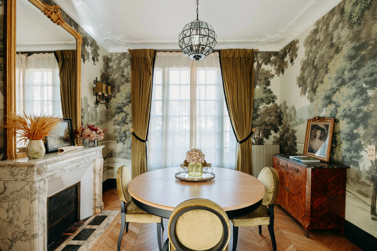 Installée dans l’ancien bureau, la salle à manger conserve sa cheminée et son trumeau d’origine, témoins du caractère historique de la maison. Un papier peint sur mesure signé Ananbô habille l’espace. De grandes portes vitrées accordéon ont été déposées afin de créer un accès direct entre la cuisine et la salle à manger, améliorant la circulation et renforçant la convivialité des espaces de réception.