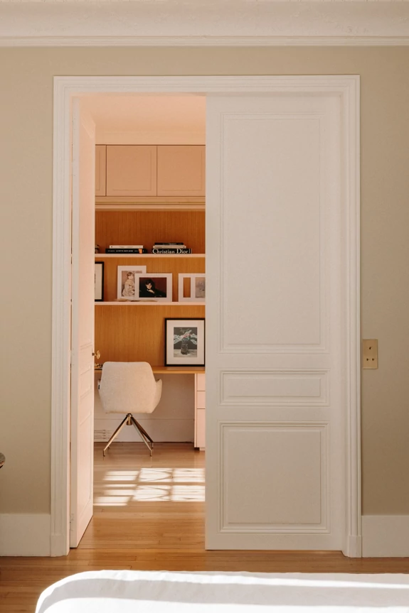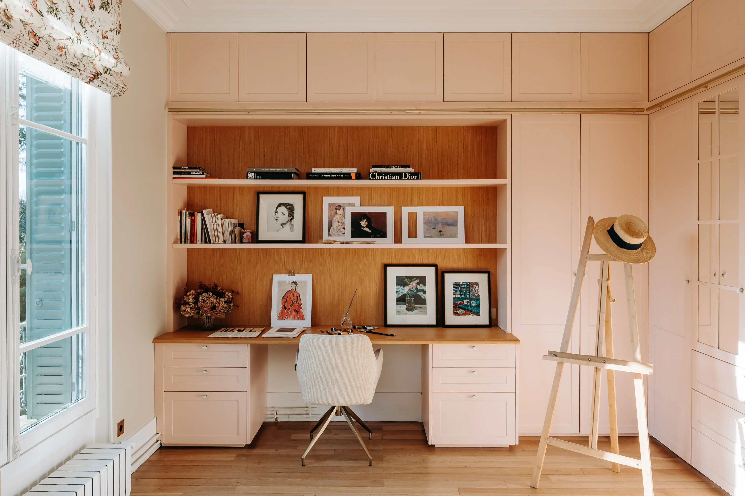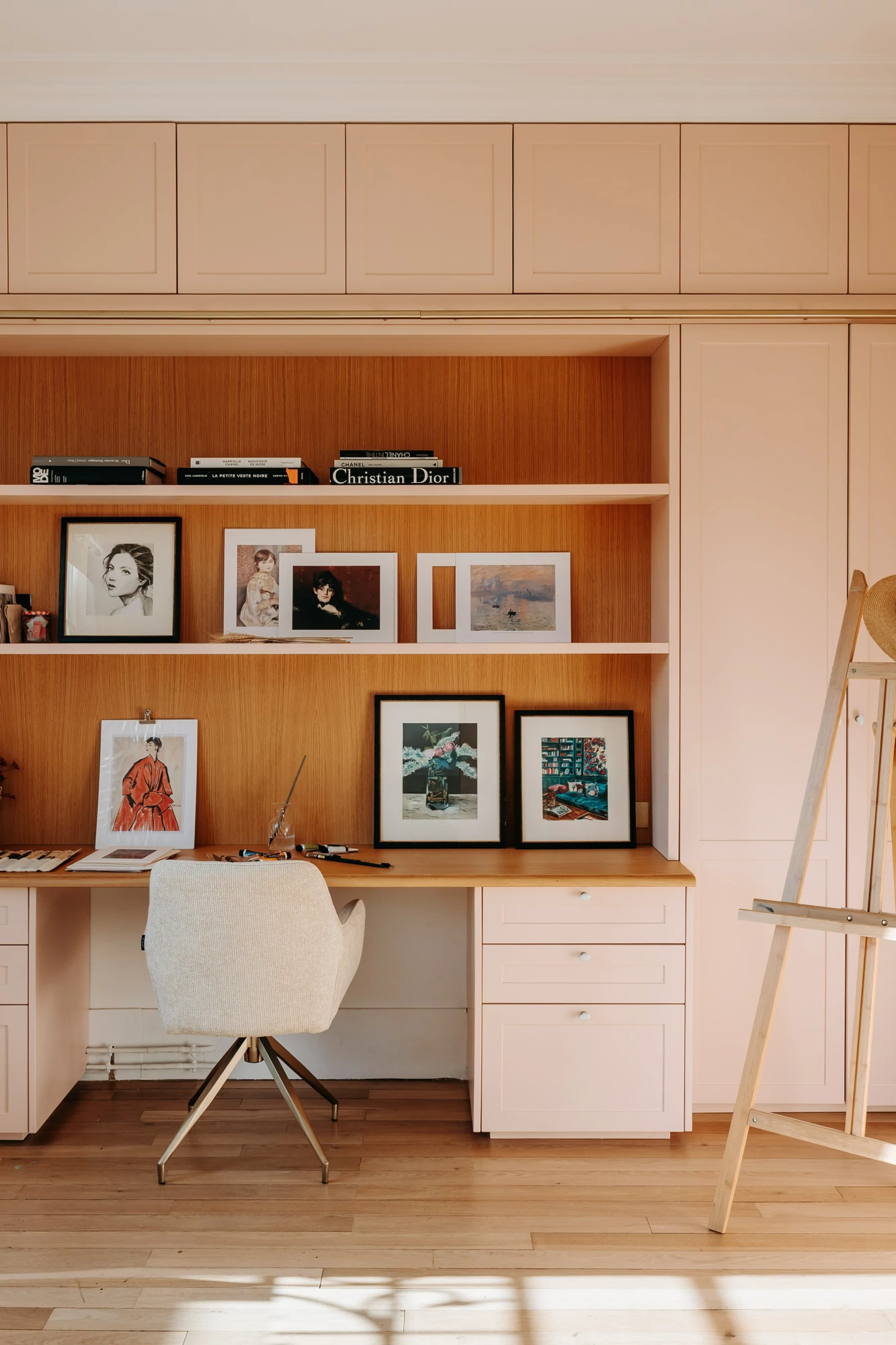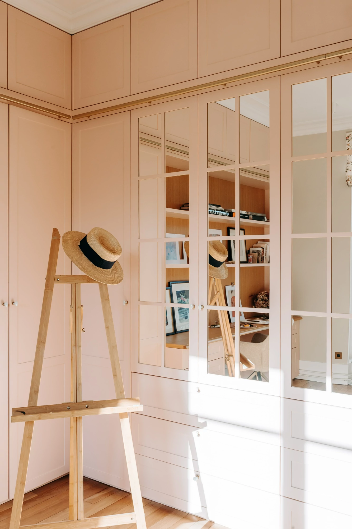Une ouverture a été créée afin d’offrir un accès direct au petit atelier, servant aussi de dressing. La cheminée a été déposée afin de libérer de la surface. Les corniches ont été modifiées pour passer devant les rangements et intégrer pleinement le dressing à la pièce. Les portes de dressing intègrent des miroirs à petits bois. Des rangements hauts sont accessibles grâce à une échelle amovible coulissant le long d’une barre, pouvant passer au-dessus du bureau. Un évier dissimulé dans les rangements permet à la cliente de nettoyer ses pinceaux lorsqu’elle peint. Le plan du bureau, en bec de corbin, fait écho à celui de la cuisine.