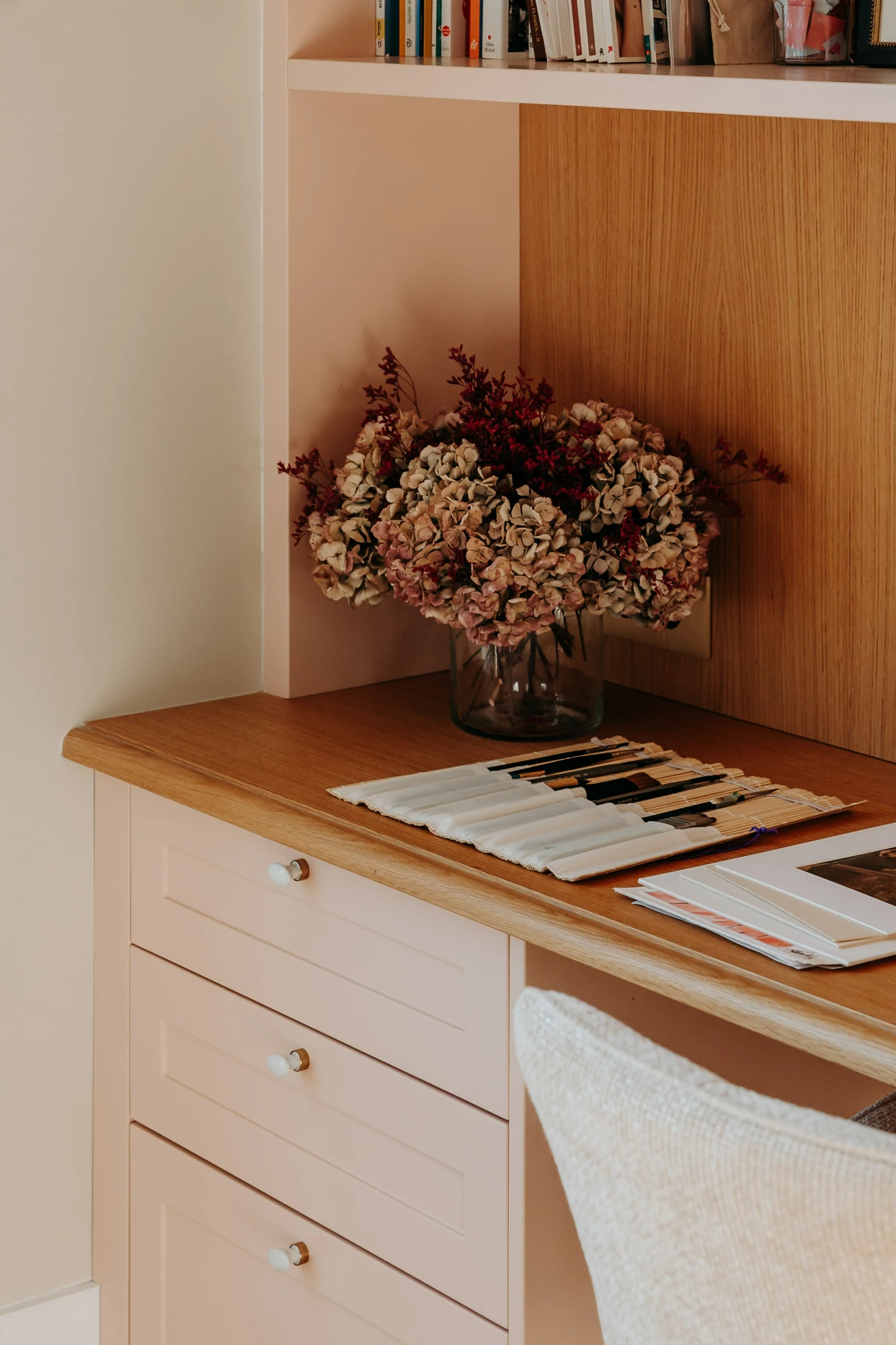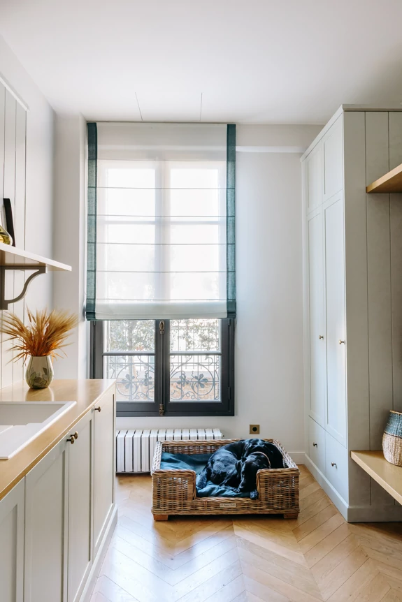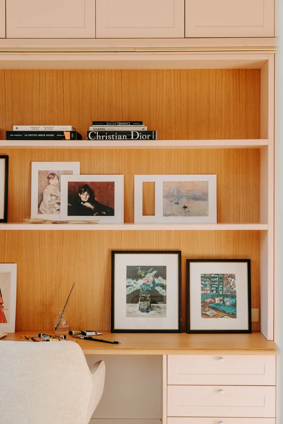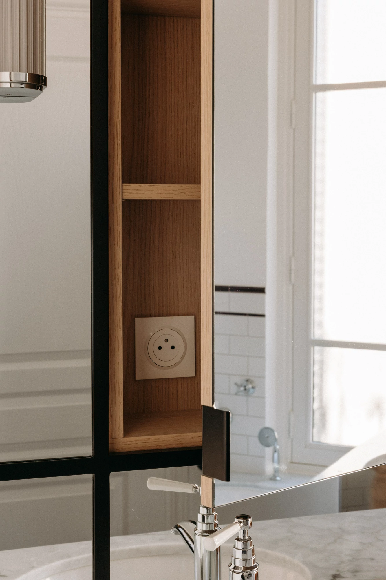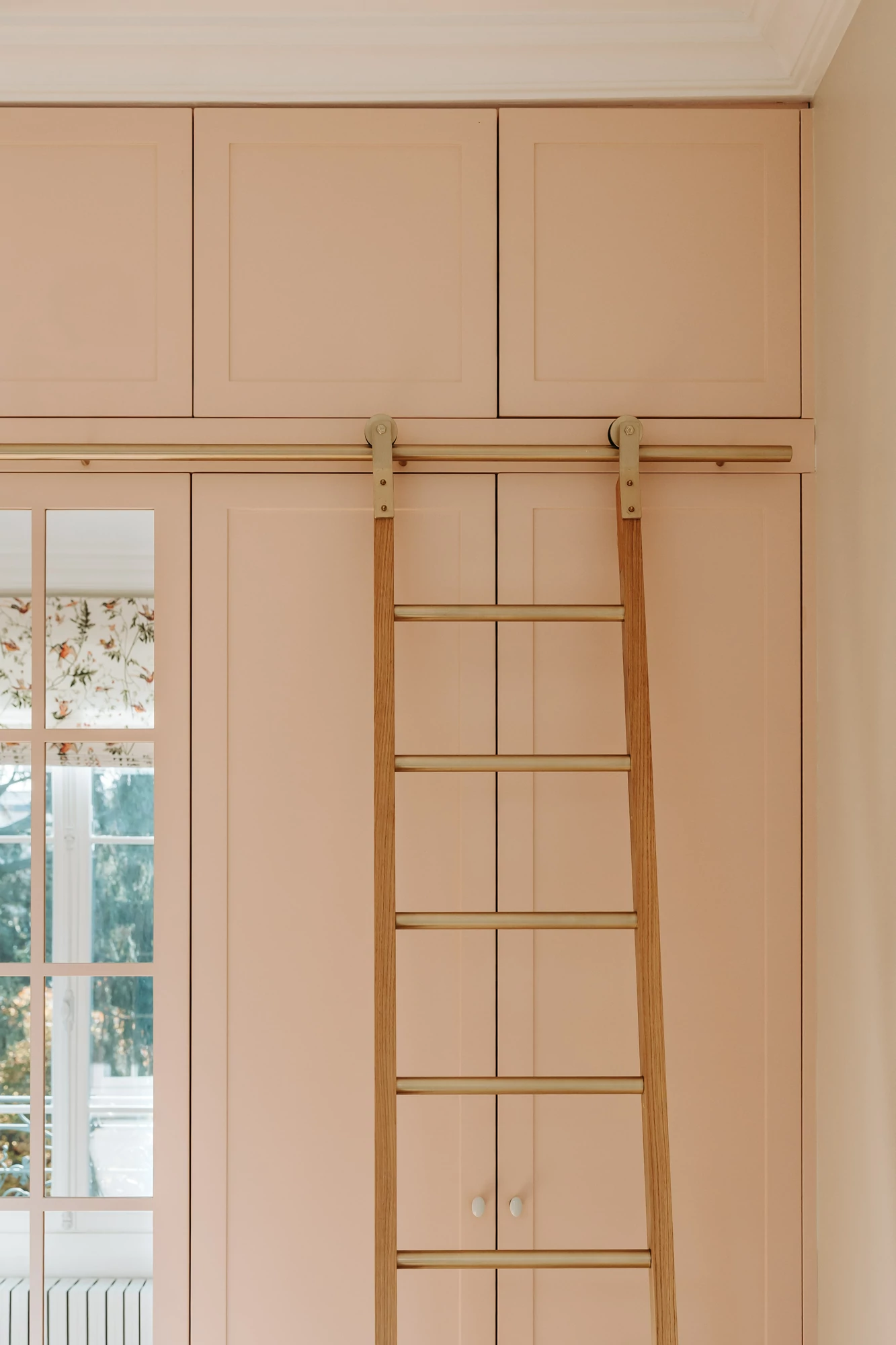 Une ouverture a été créée afin d’offrir un accès direct au petit atelier, servant aussi de dressing. La cheminée a été déposée afin de libérer de la surface. Les corniches ont été modifiées pour passer devant les rangements et intégrer pleinement le dressing à la pièce. Les portes de dressing intègrent des miroirs à petits bois. Des rangements hauts sont accessibles grâce à une échelle amovible coulissant le long d’une barre, pouvant passer au-dessus du bureau. Un évier dissimulé dans les rangements permet à la cliente de nettoyer ses pinceaux lorsqu’elle peint. Le plan du bureau, en bec de corbin, fait écho à celui de la cuisine.