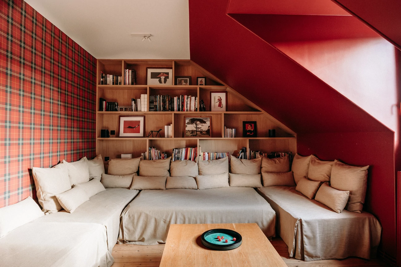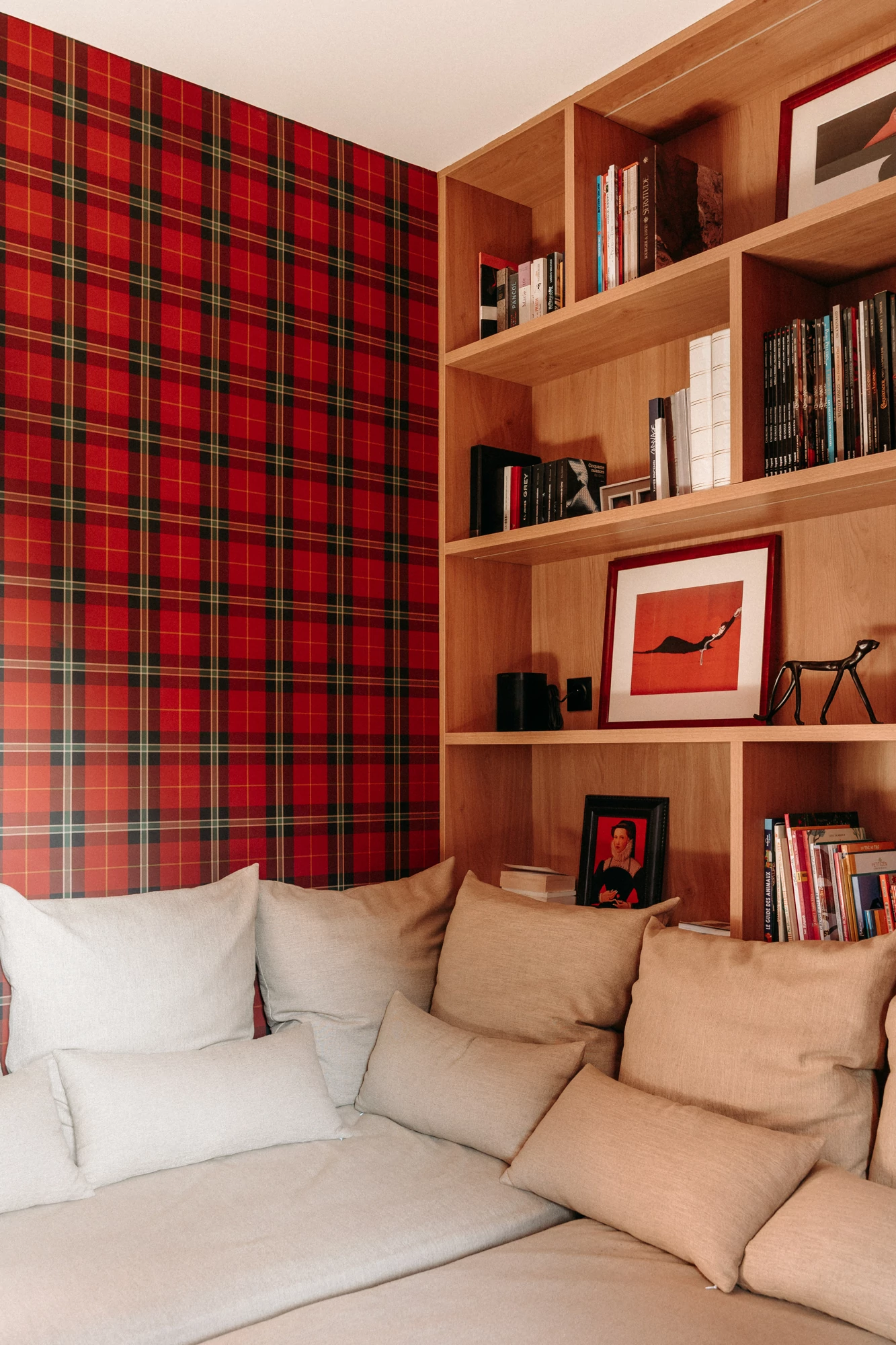 Enfin, la dernière pièce a été pensée comme un petit cinéma familial. Les clients souhaitaient une ambiance enveloppante, avec une très grande télévision et une bibliothèque généreuse occupant tout un pan de mur. Un papier peint tartan renforce le caractère chaleureux et feutré de la pièce.