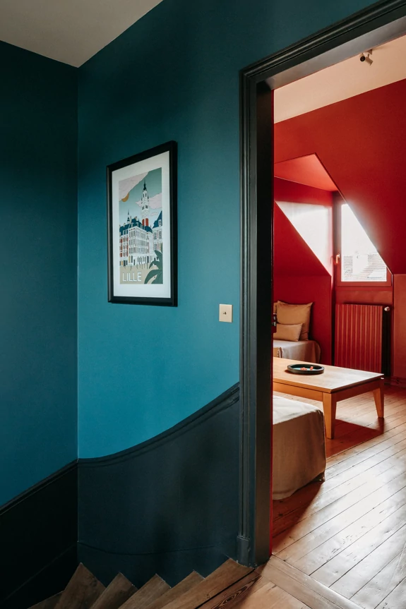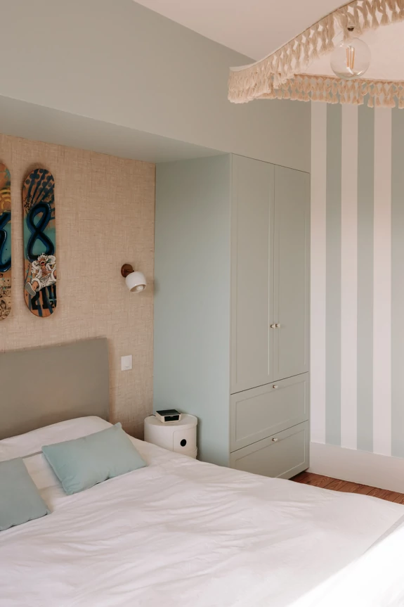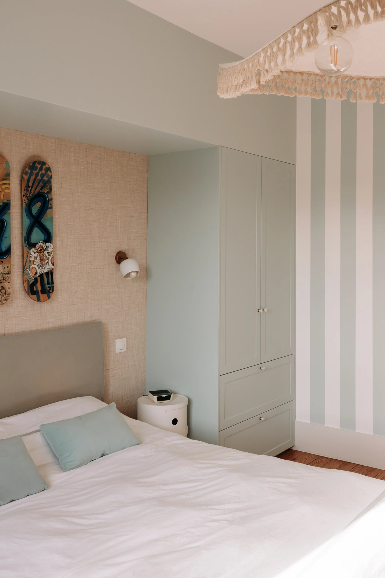 La première chambre offre une ambiance dominée par le bleu, couleur. Le lit est encadré par des dressings intégrés, optimisant les rangements. Les murs sont traités avec une peinture en bandes bleues et blanches, complétée par un papier peint décoratif.