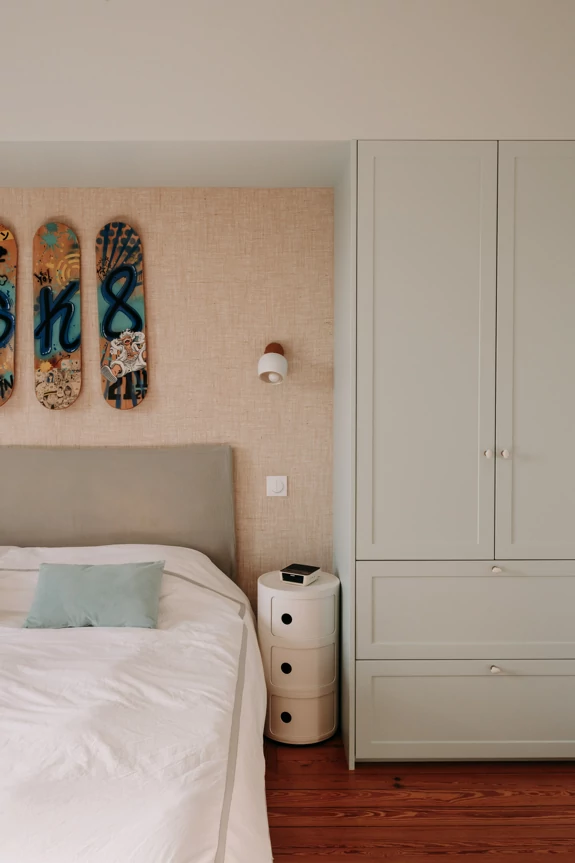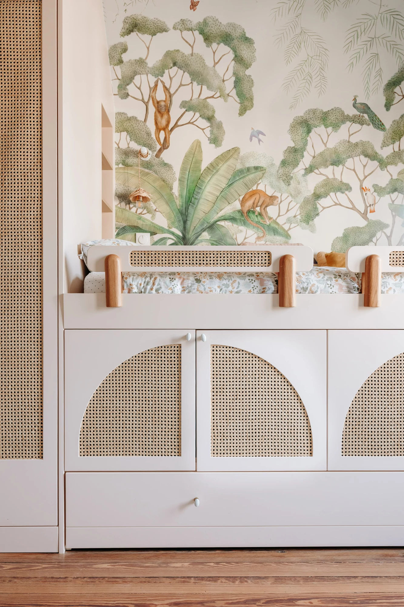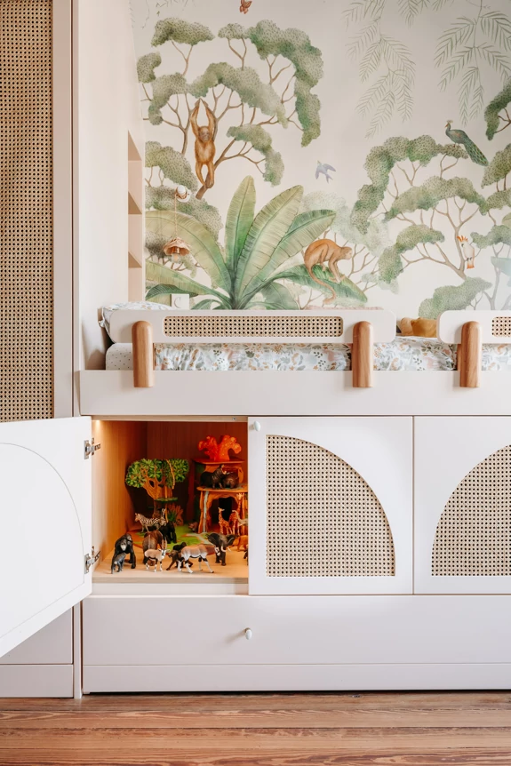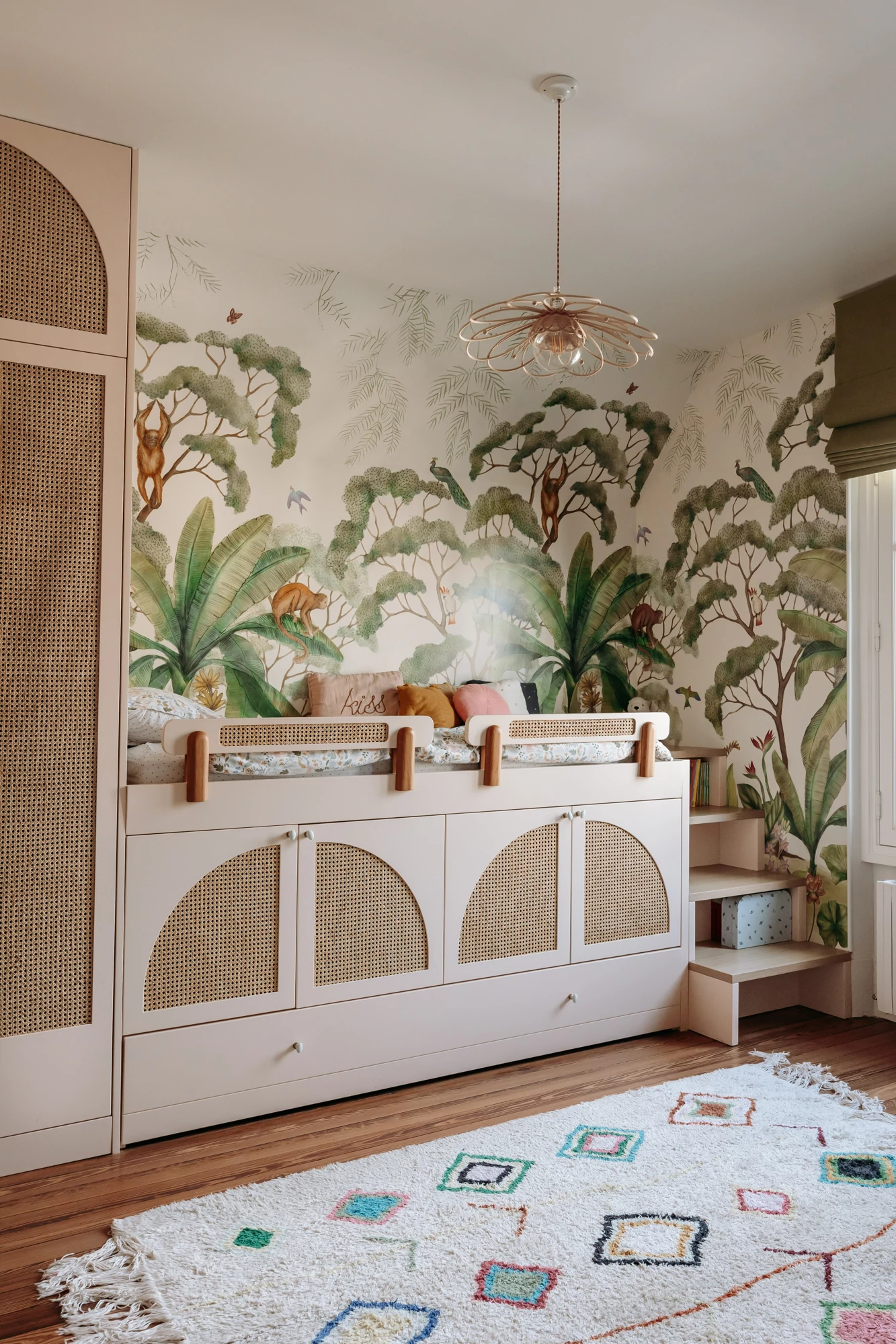 La deuxième chambre enfant a été pensée de manière ludique et fonctionnelle. Un lit en hauteur intégrant une bibliothèque, est accessible par un escalier dont les marches servent également de rangements pour les livres. Sous le lit, deux placards accueillent les jouets ; équipés d’un éclairage à l’ouverture, ils permettent de créer un petit espace de jeux directement à l’intérieur. Une fois les portes fermées, le désordre disparaît ! Le papier peint, acheté par les clients aux États-Unis, apporte une touche personnelle et unique à la chambre.