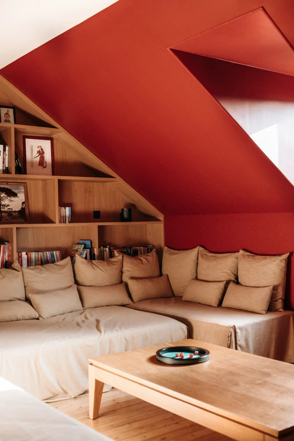 À l’origine étroit et cloisonné, le palier comportait un accès vers un débarras et une salle de bain. La cloison a été déposée et le garde-corps prolongé, permettant d’agrandir l’espace et de profiter pleinement de la lumière naturelle apportée par le grand vélux existant en toiture. Un rangement bas ajouré en cannage y a été intégré.