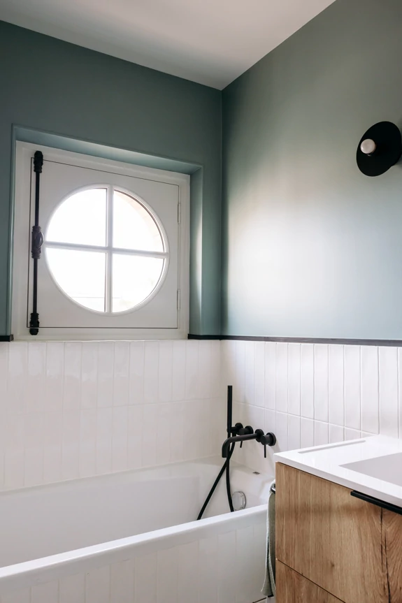 Les clients se sont montrés très investis tout au long de ce projet. Ils ont notamment chiné eux-même une grande partie des luminaires et du mobilier, et ont participé activement au choix des couleurs, apportant ainsi une touche très personnelle à l’ensemble de la maison.