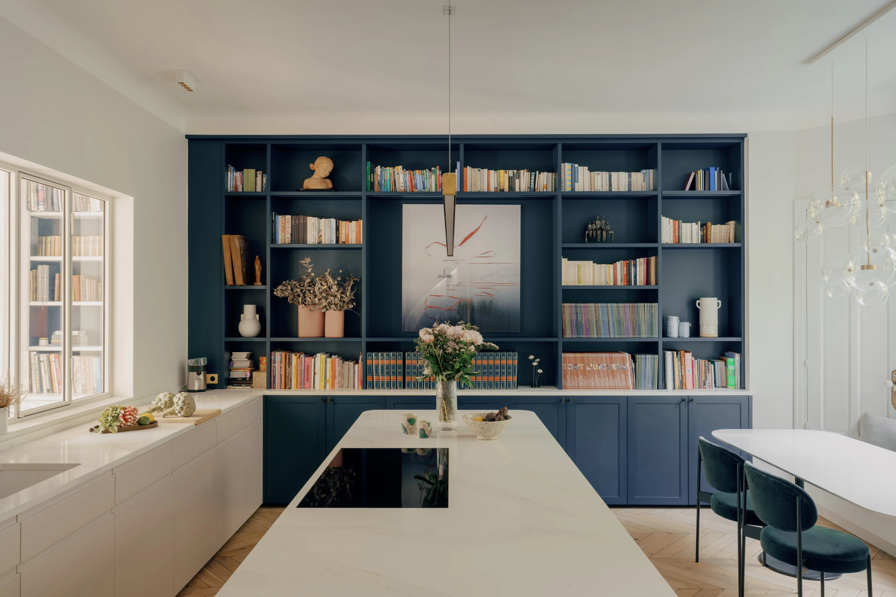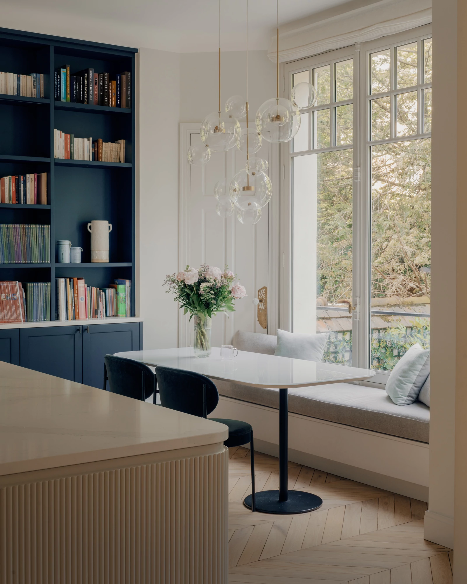 La cuisine a été agrandie pour créer désormais un grand espace de vie convivial et lumineux. Un bow-window d’origine a été mis en valeur pour créer une alcôve accueillante, parfaite pour y nicher une banquette sur mesure et créer un espace repas agréable. Dans cette cuisine, les clients souhaitaient de la couleur : une palette audacieuse et chaleureuse a donc été pensée pour insuffler personnalité et caractère à cet espace central de la maison.